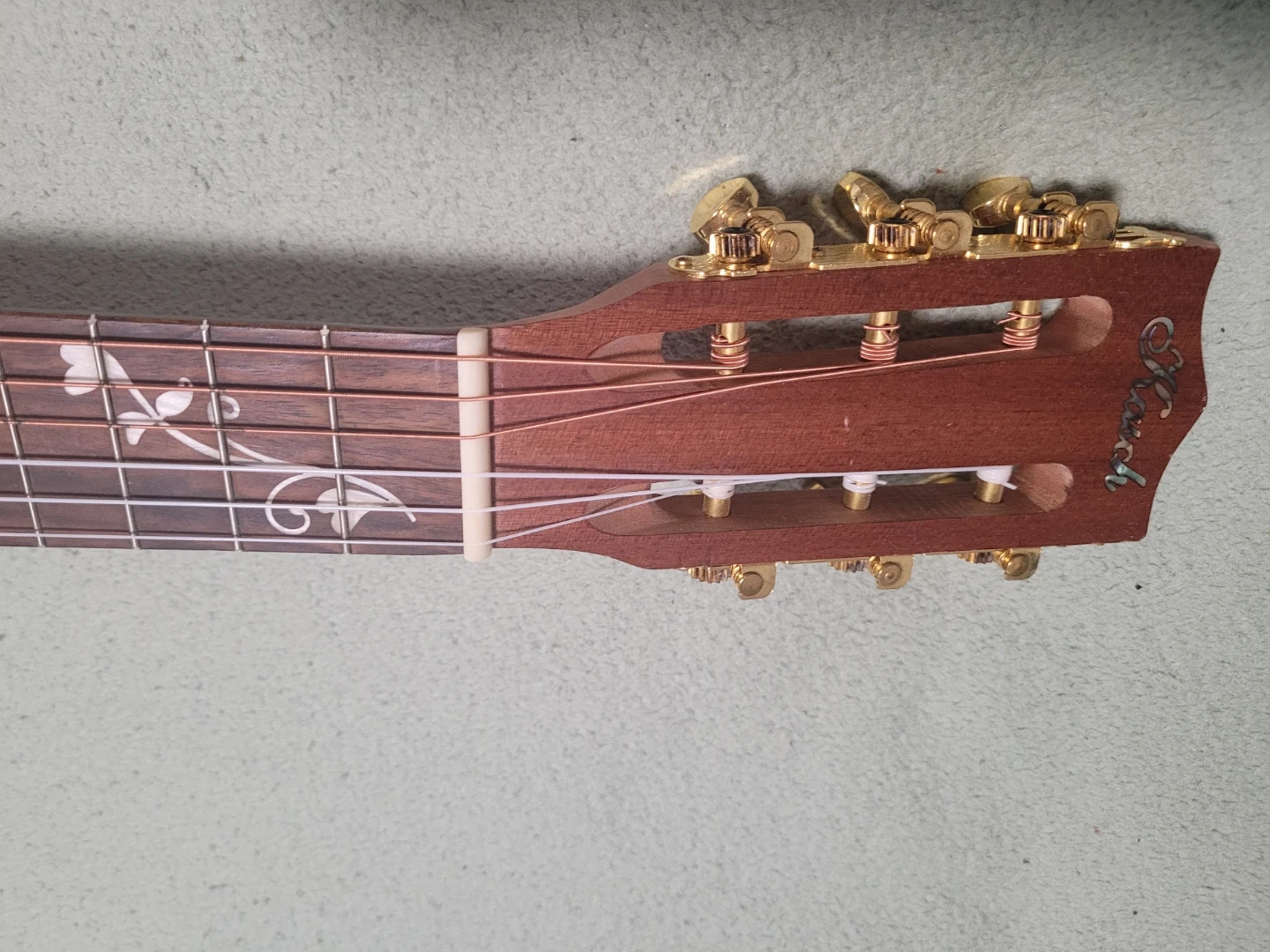 This is a Klasch guitalele. It features a beautiful wood grain and decorative inlay on the fretboard. It's a great instrument for beginners or casual players.