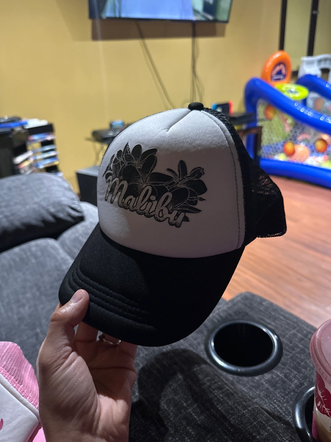 Selling a Malibu trucker hat in black and white. It's in great condition and ready for a new home!