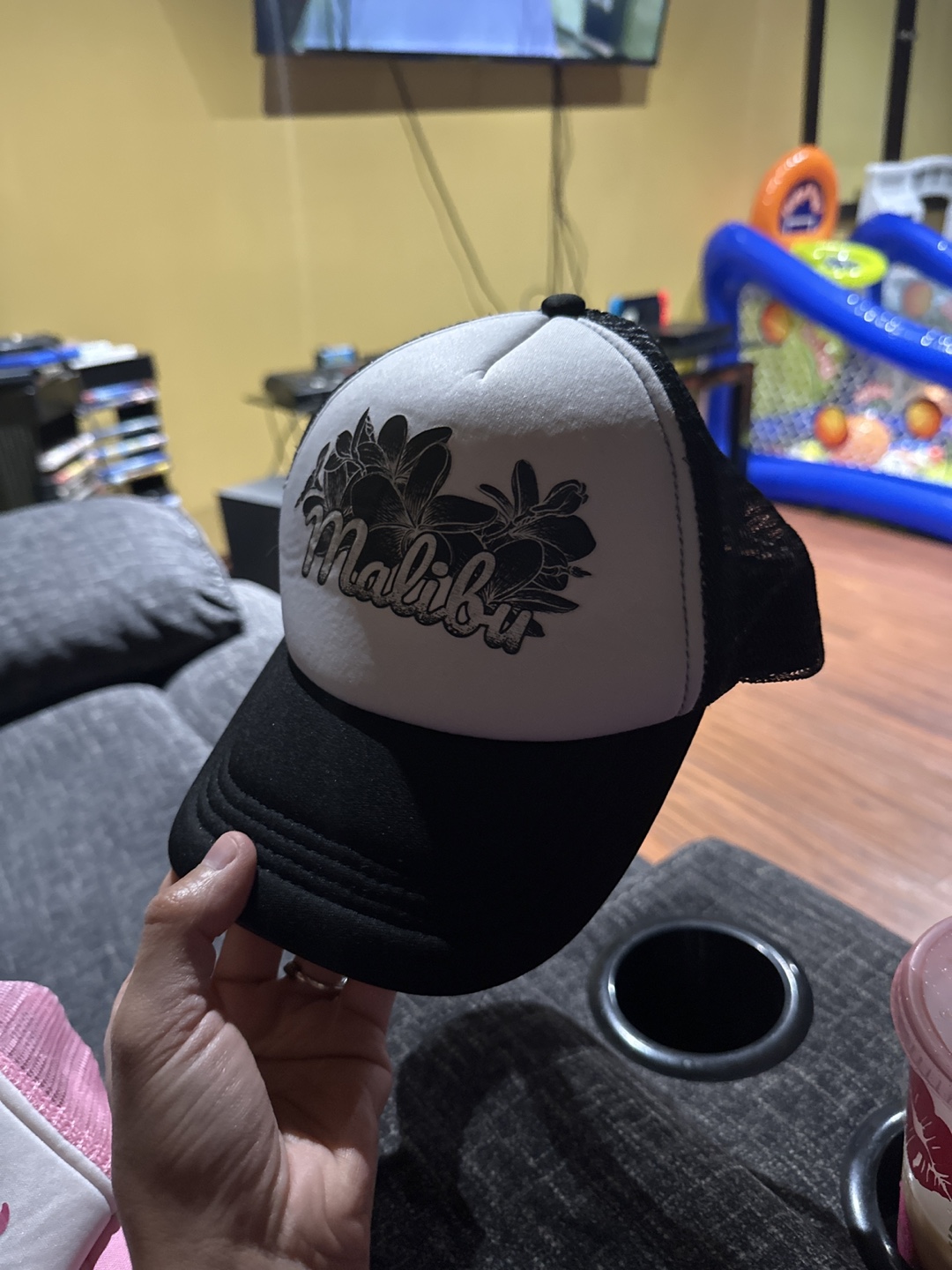 Selling a Malibu trucker hat in black and white. It's in great condition and ready for a new home!