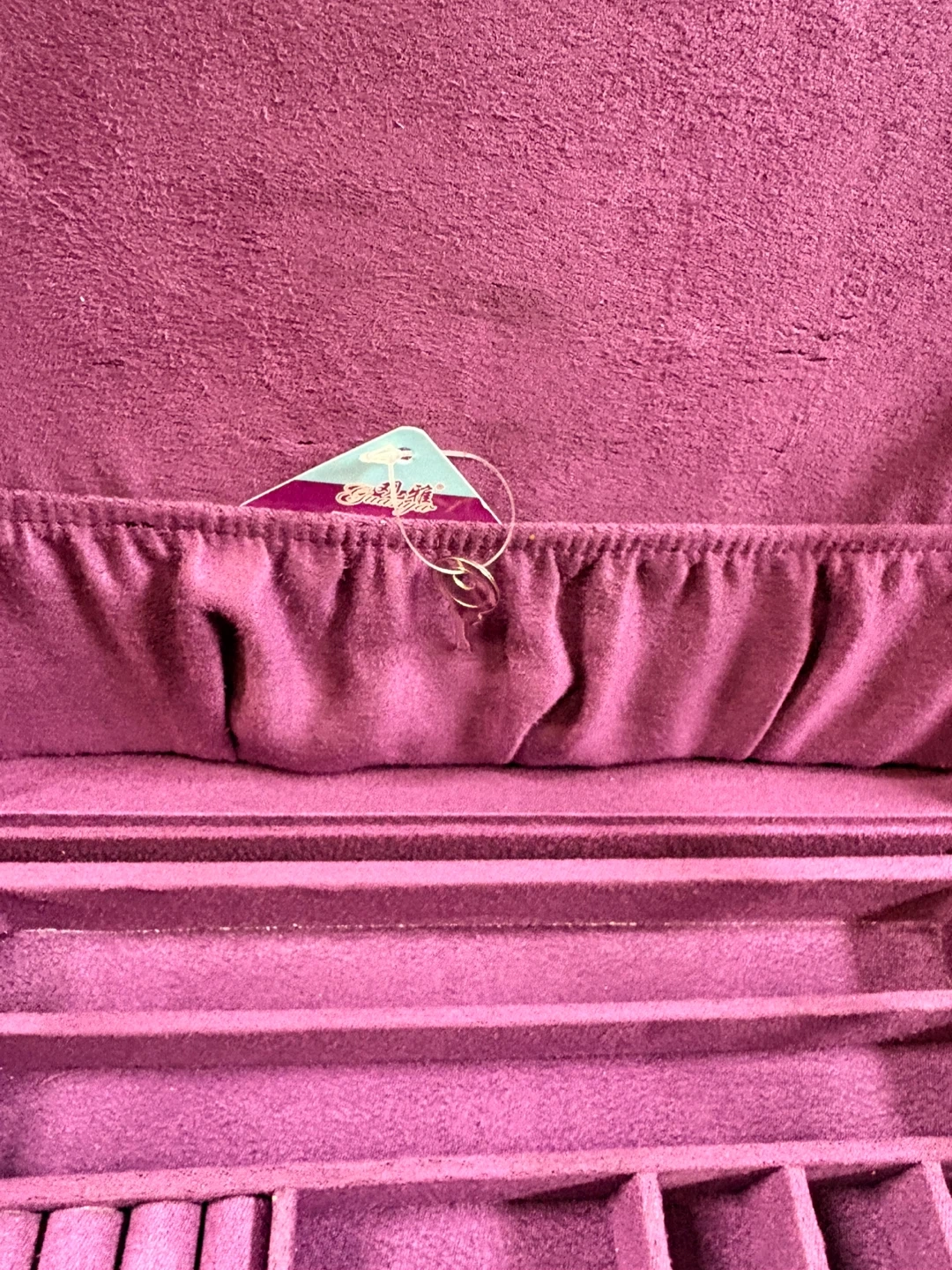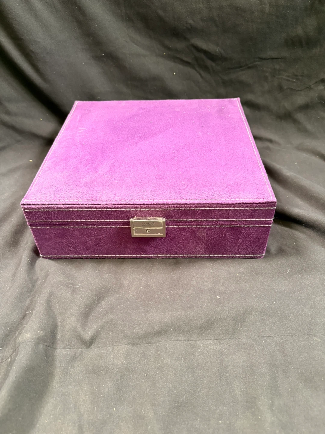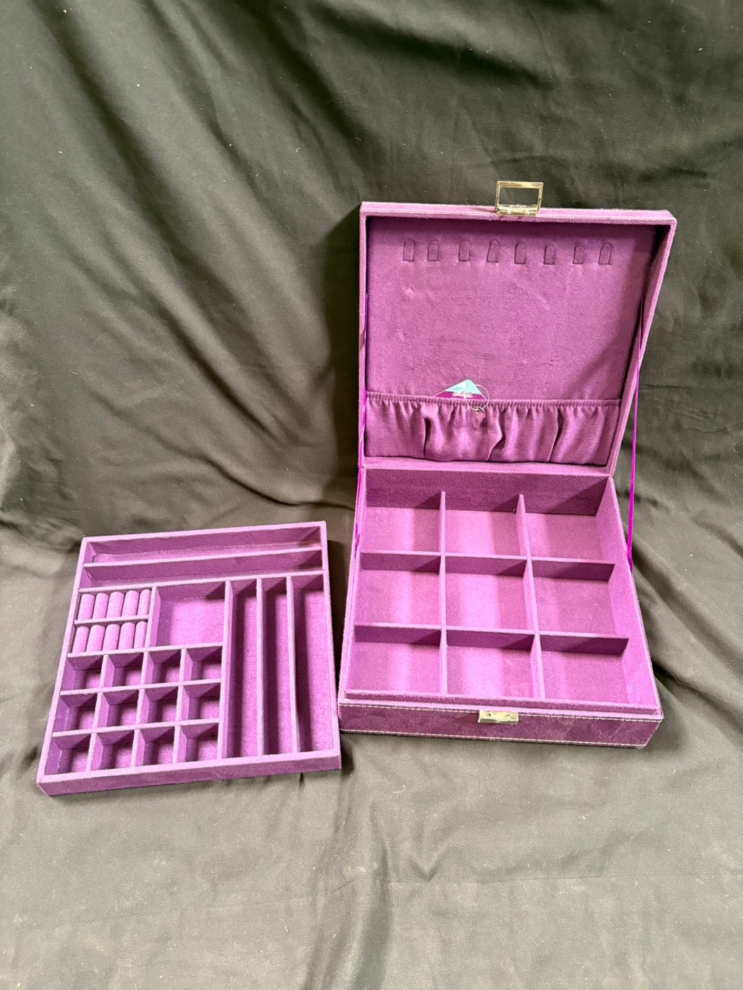 Purple suede jewellery box with multiple compartments. Features a removable tray for extra storage and organization. It's a great way to keep your trinkets tidy!