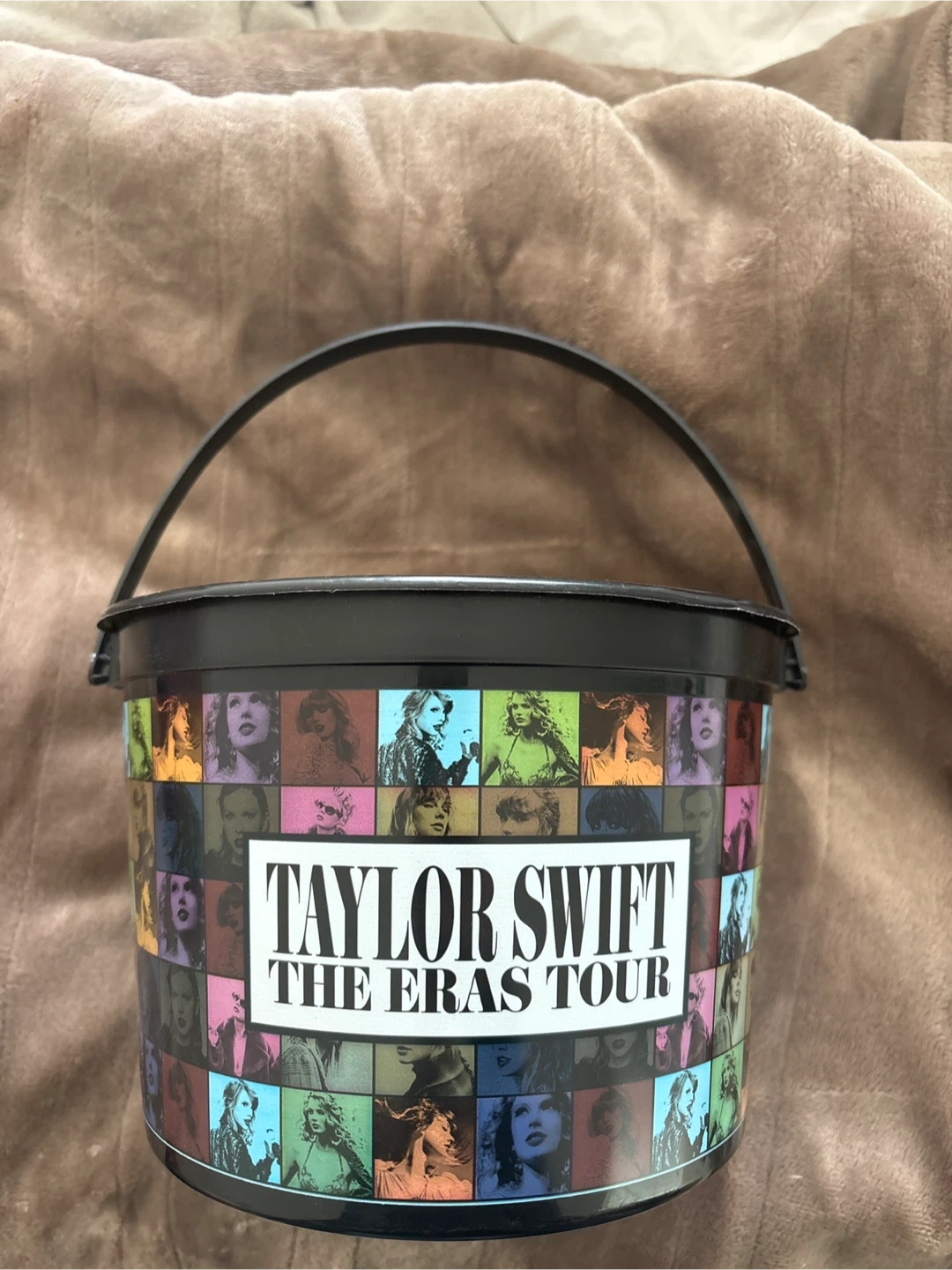 This bucket features images of Taylor Swift from different eras. It's made of plastic and has a handle for carrying.