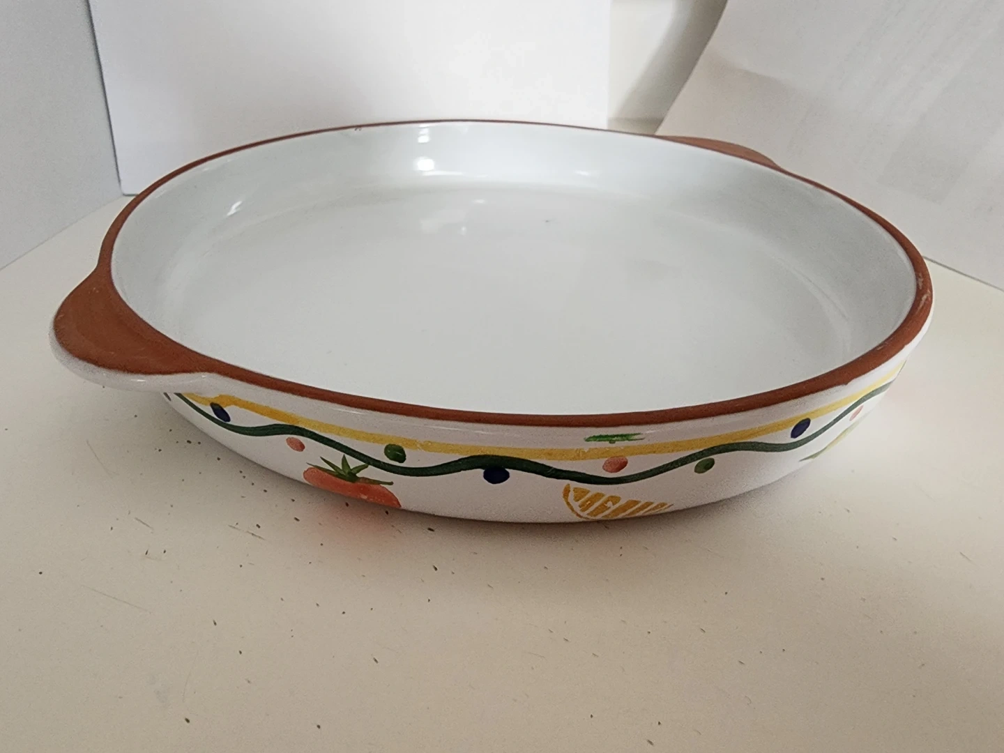 This round casserole baking dish has a white interior and a decorative exterior. Its terracotta-colored base is visible from the underside. Oven safe