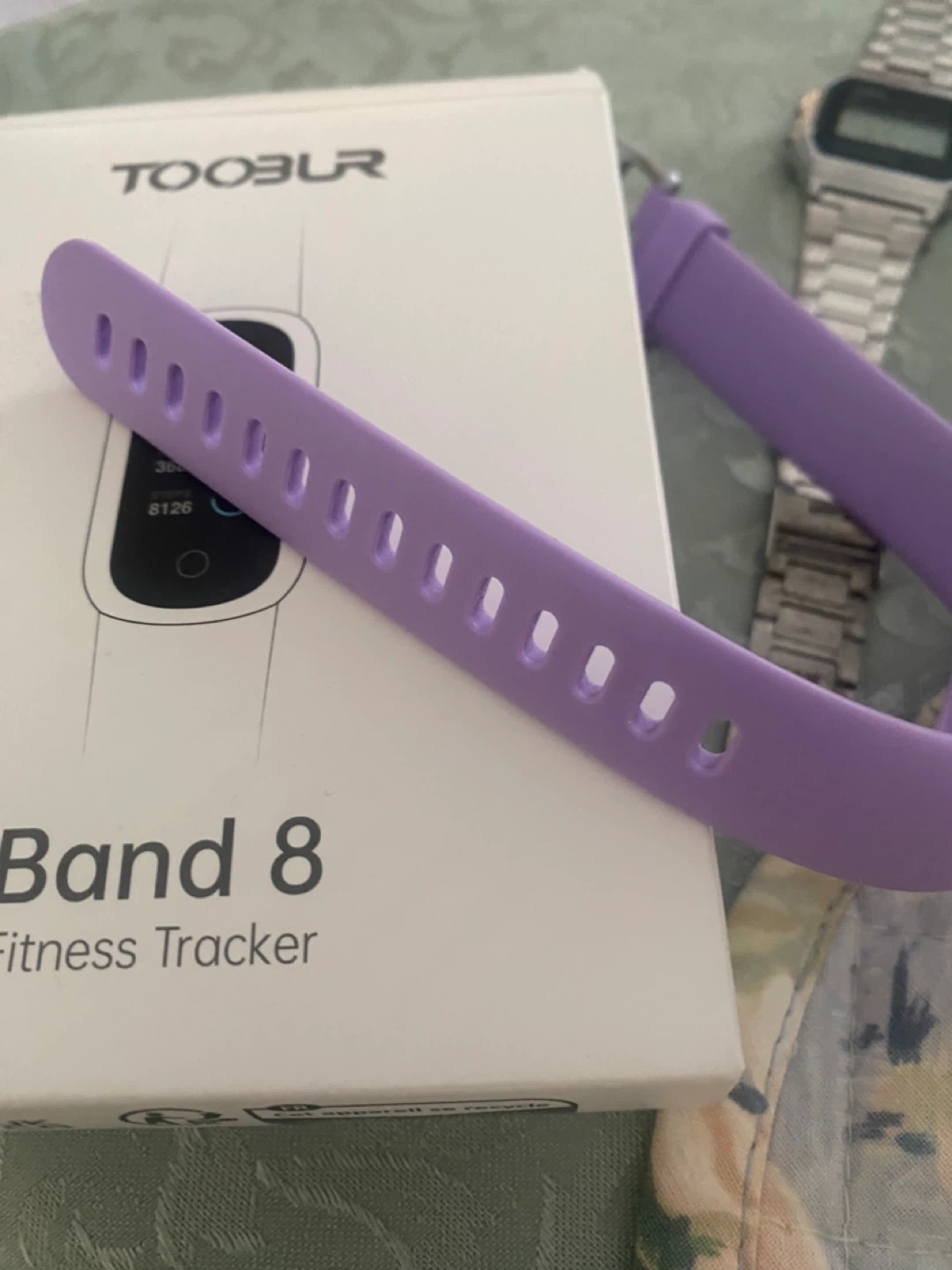 This is the TOOBUR Band 8 fitness tracker. It's designed to monitor your activity and health metrics. It's great for tracking steps, heart rate, and calories burned!