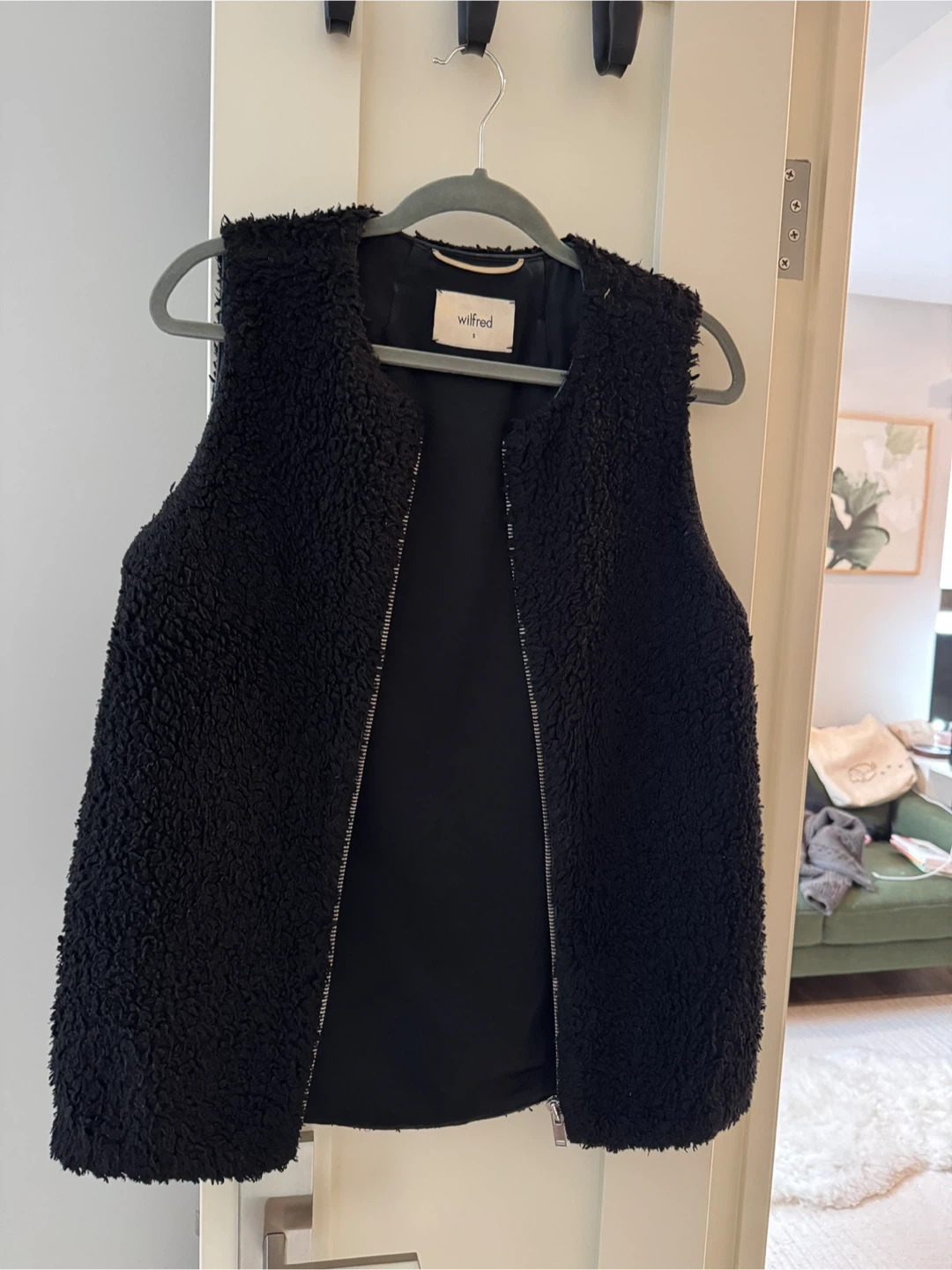 Cozy black sherpa vest from Wilfred. It's made of soft, fluffy material with a zip-up front.