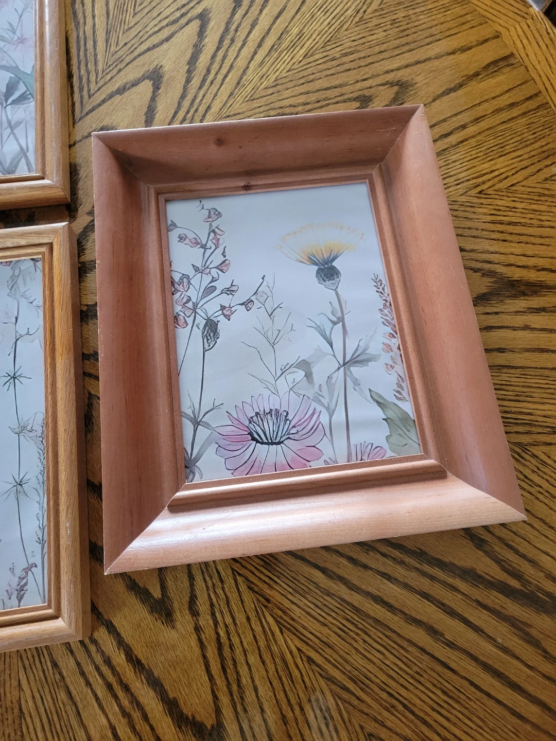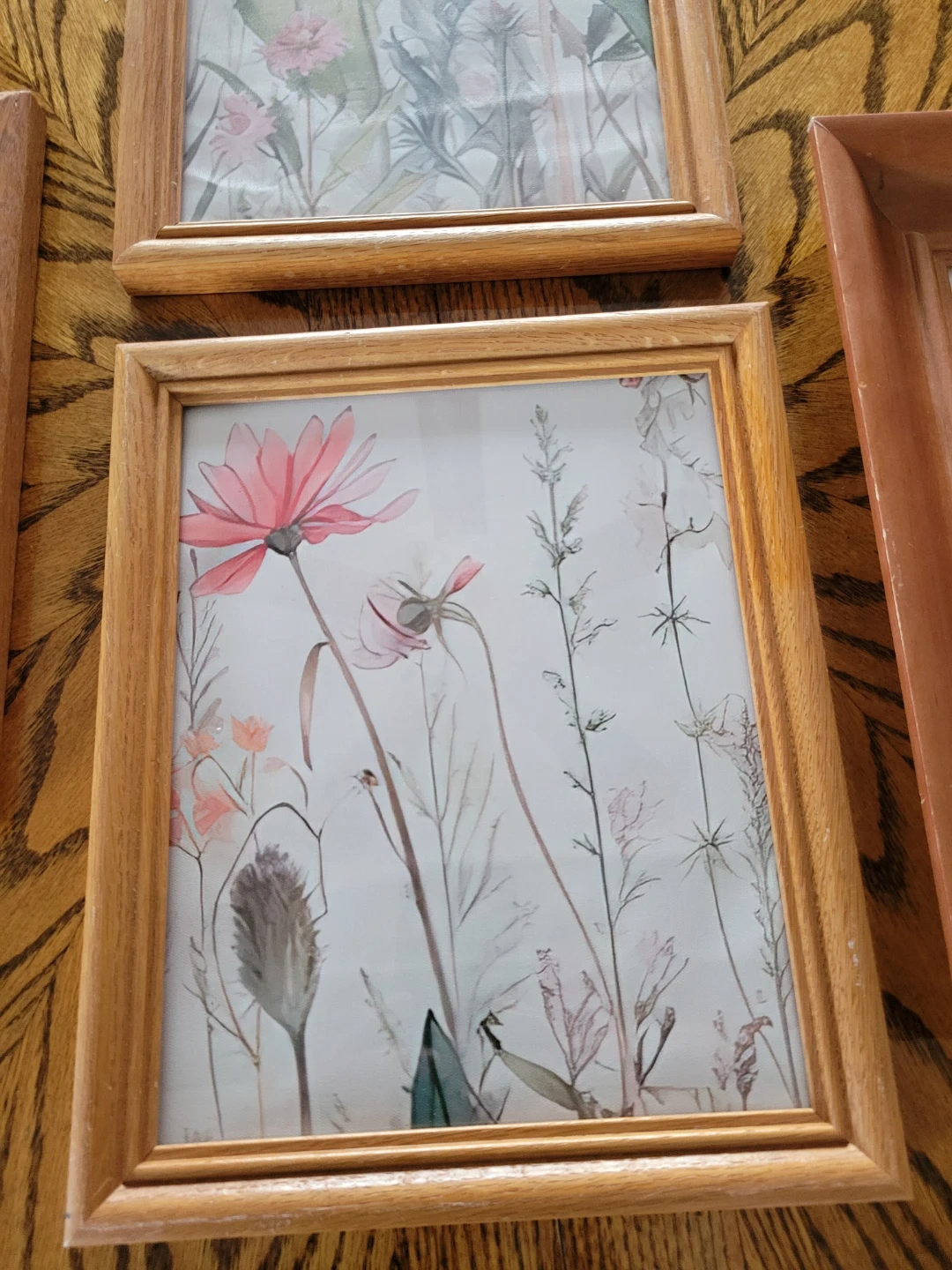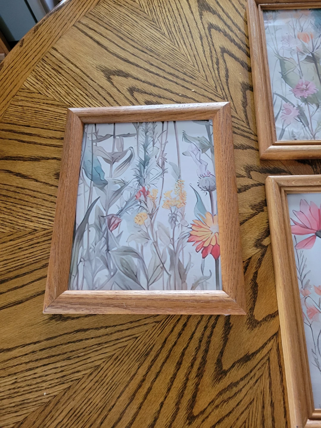 Vintage oak picture frames, each showcasing delicate floral art. These frames add a touch of timeless elegance to any room, perfect for displaying cherished memories or enhancing your art collection. While these frames are used, they maintain a good quality.