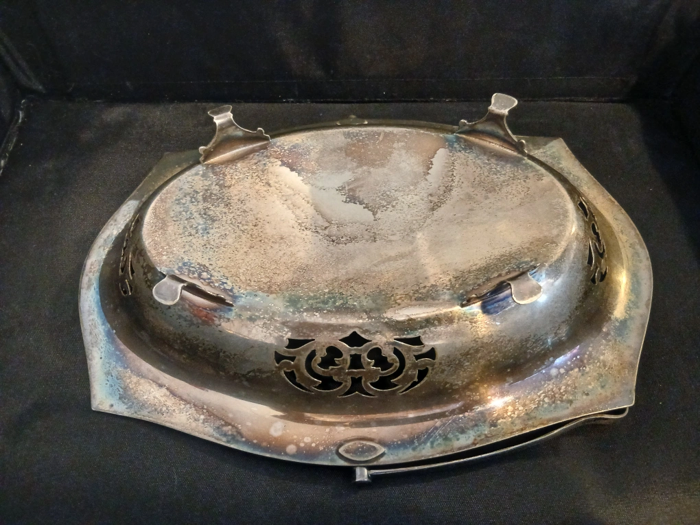 This is a silver-plated serving basket with a handle. It features ornate cut-out details along the sides. Perfect for serving bread or pastries!