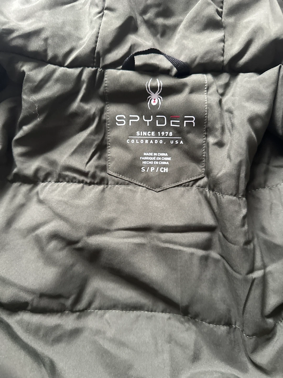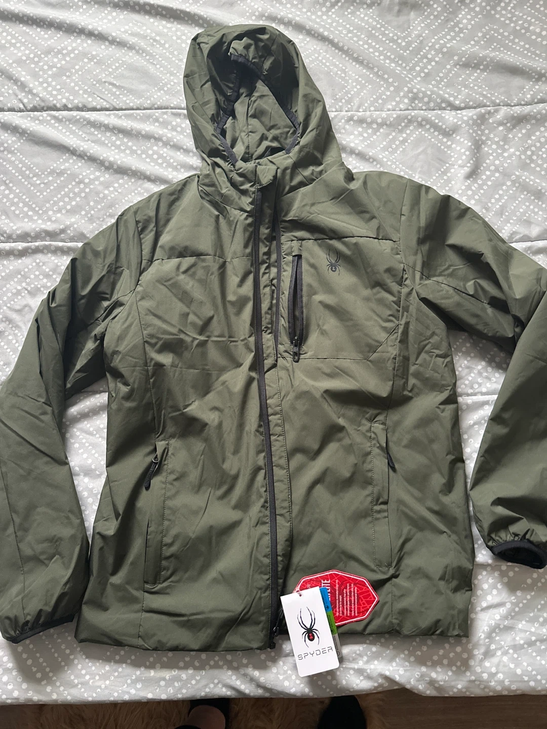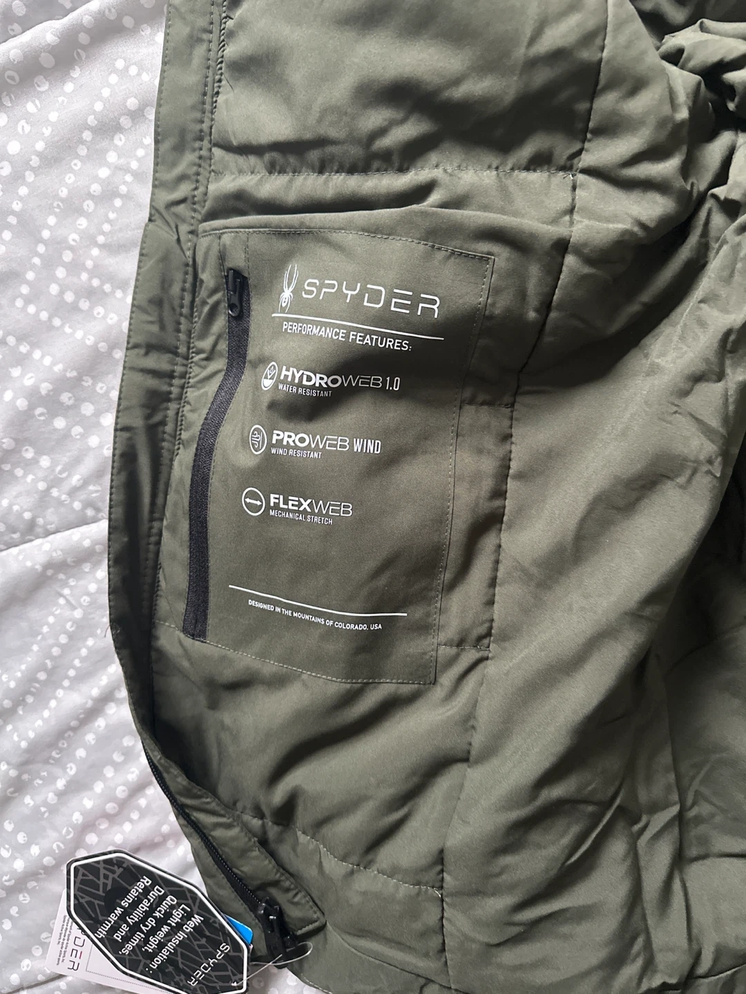 Selling a Spyder jacket in olive green, size small. It features HydroWeb 1.0 for water resistance, ProWeb for wind resistance, and FlexWeb for mechanical stretch. It's designed in the mountains of Colorado, USA.Sell it because bought wrong size