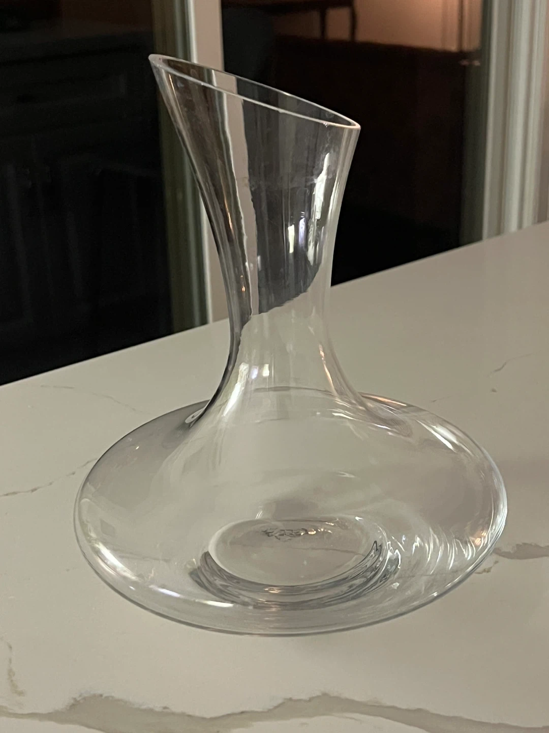 This is a clear glass wine decanter. It's made of glass. This decanter is useful for aerating wine before serving. It would be used when entertaining guests or enjoying a special bottle of wine.