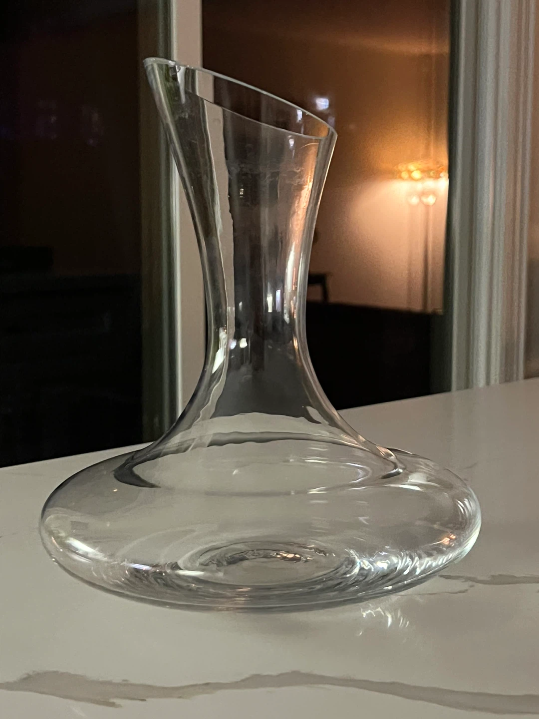 This is a clear glass wine decanter. It's made of glass. This decanter is useful for aerating wine before serving. It would be used when entertaining guests or enjoying a special bottle of wine.