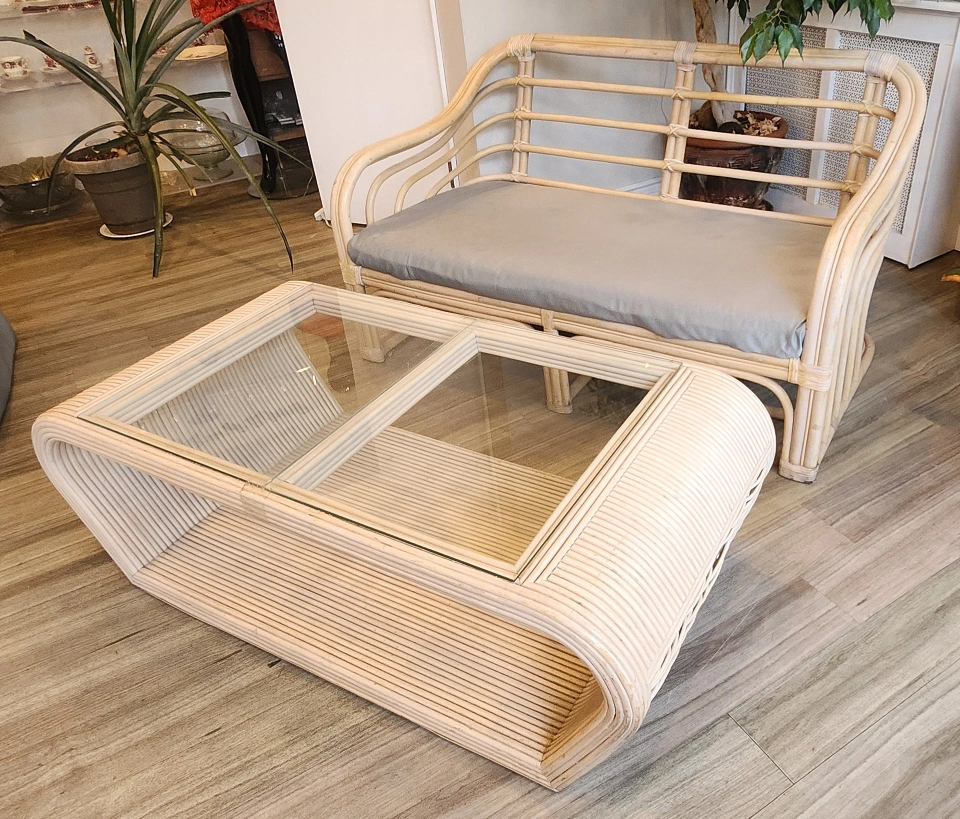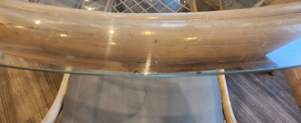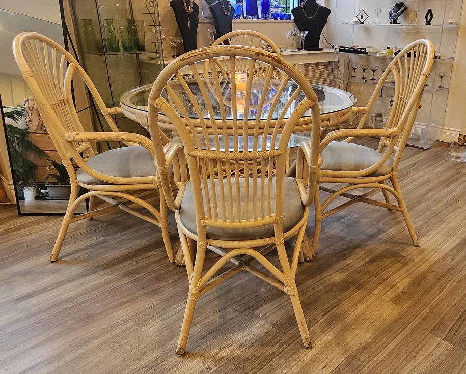 The set consists of 4 chairs, glass top round table,two seater sofa,and coffee table.