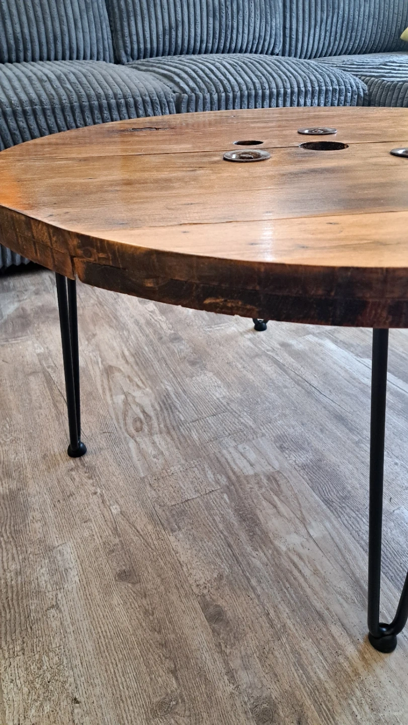 Unique coffee table made from a reclaimed wooden spool. It's finished with a clear coat and features sturdy black hairpin legs. The rustic charm of the wood grain is really something special!