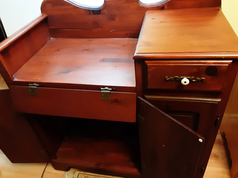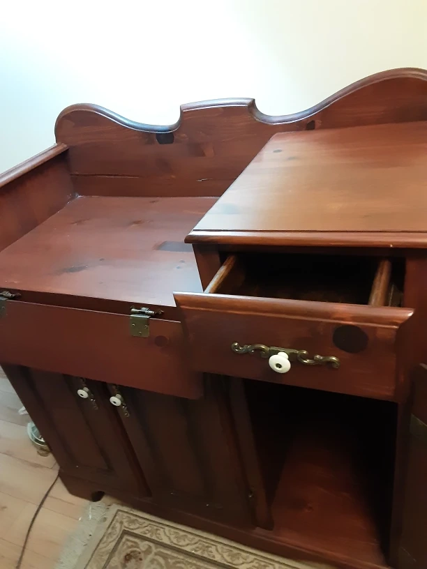 This vintage wash basin cabinet measures 37 inches wide, 18.5 inches deep, and 6.5 inches high. It's a beautiful wooden piece with storage below. Perfect for adding a classic touch to your space! I don't have the space for this beautiful piece anymore 😢