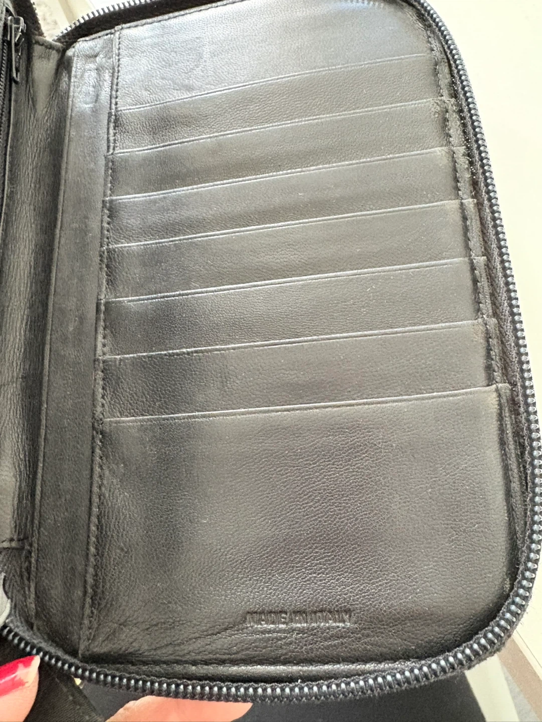 A black Prada organizer wallet made from nylon with a zip-around closure. It features multiple card slots inside. Made in Italy.
