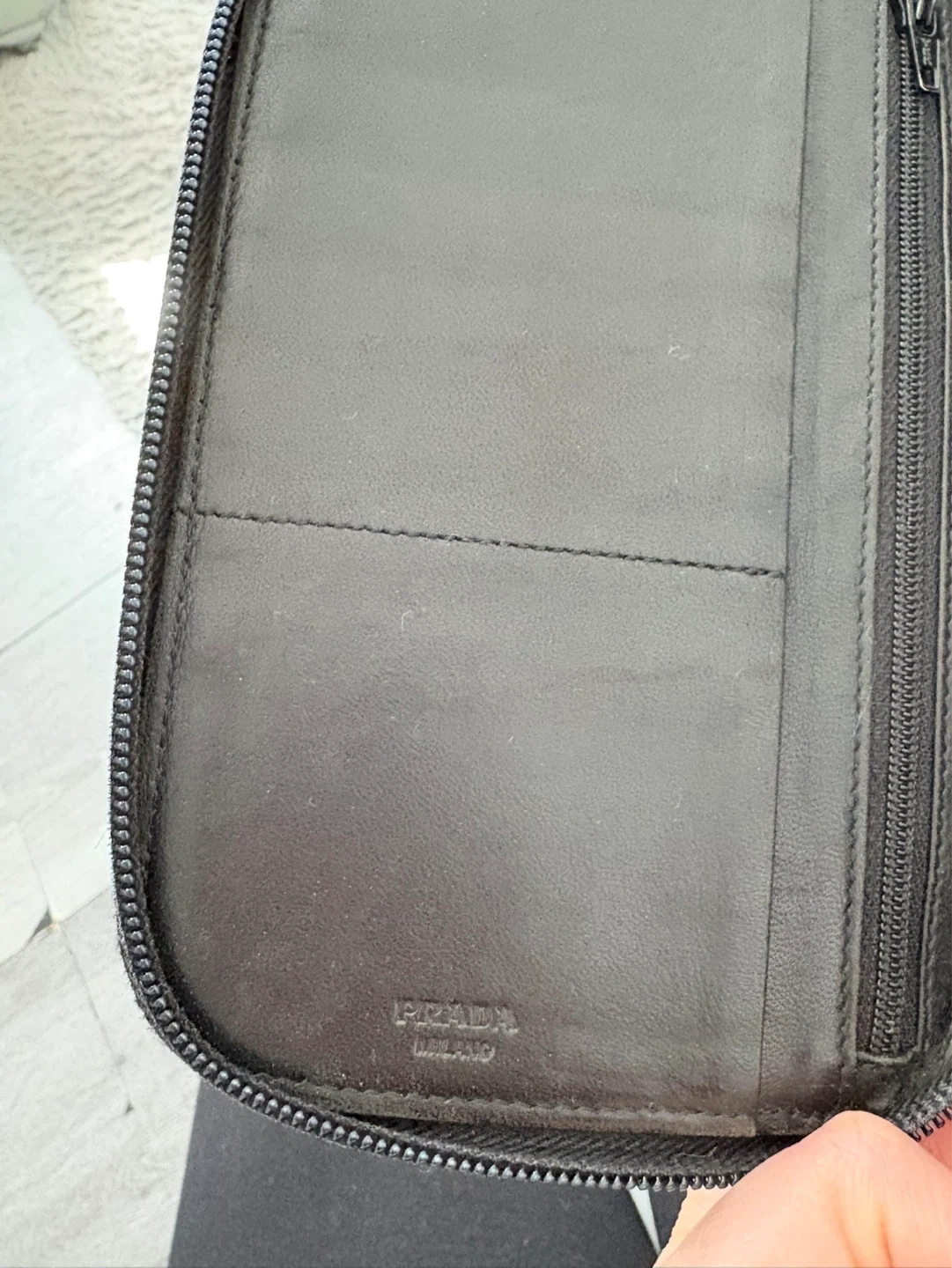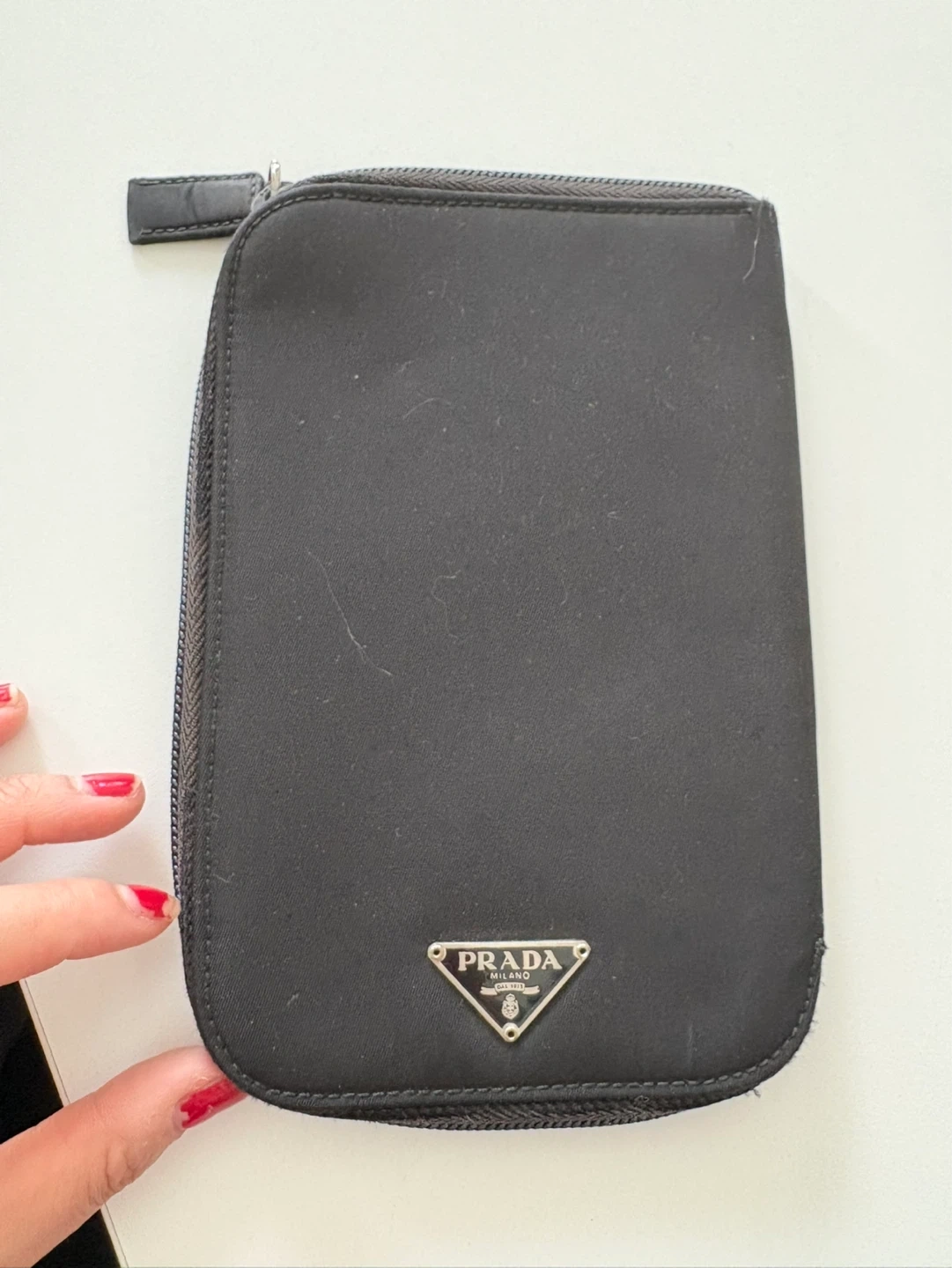 A black Prada organizer wallet made from nylon with a zip-around closure. It features multiple card slots inside. Made in Italy.