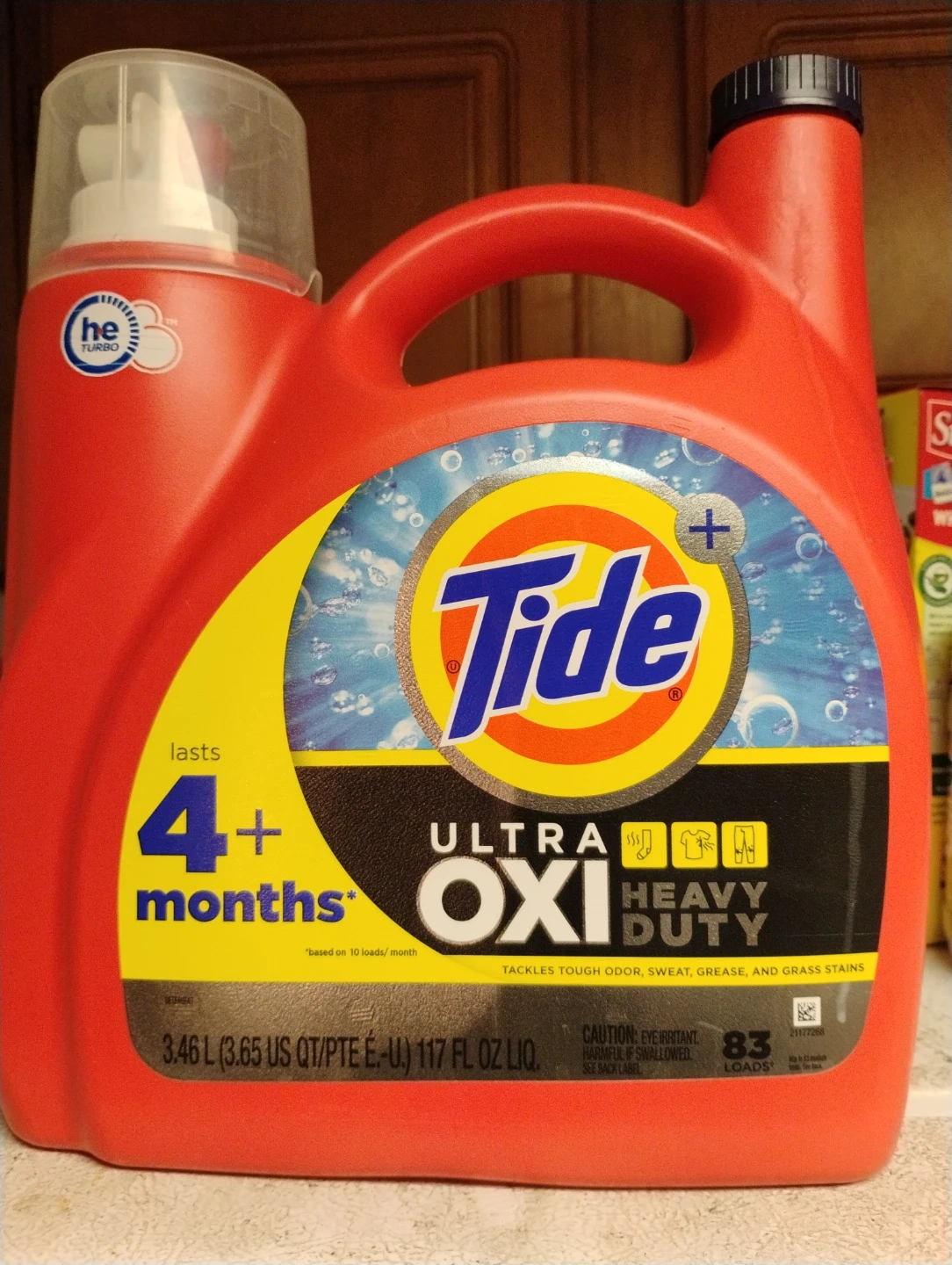 Selling a bottle of Tide Ultra Oxi Heavy Duty laundry detergent. This detergent tackles tough odors, sweat, grease, and grass stains. It comes in a 3.46 L (117 fl oz) bottle and lasts for 4+ months based on 10 loads/month. It's great for HE turbo washing machines!