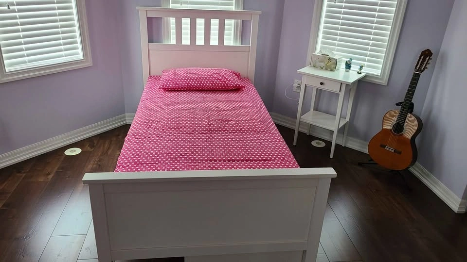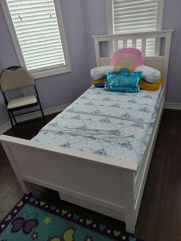 Spacious white single bed frame with two pull-out storage drawers underneath, super handy for toys or clothes. Great for a kid's room. Mattress can be included.