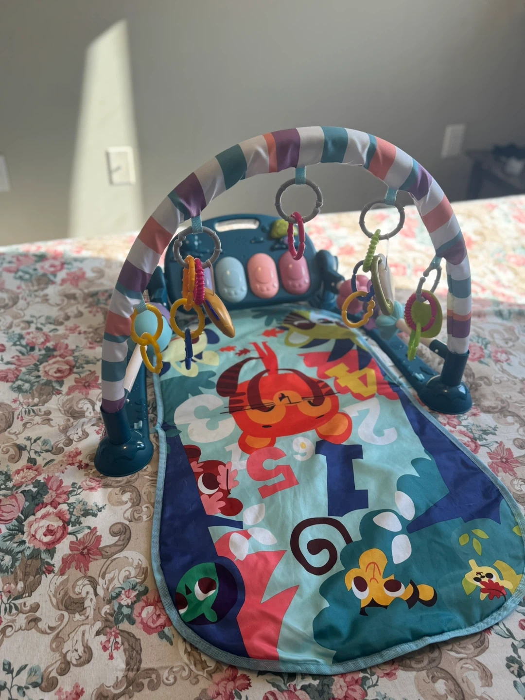 This baby activity gym and play mat features a colourful mat with animal designs and numbers. It includes an overhead arch with hanging toys and a piano keyboard for interactive play. Babies can enjoy tummy time and develop motor skills with this engaging play set.