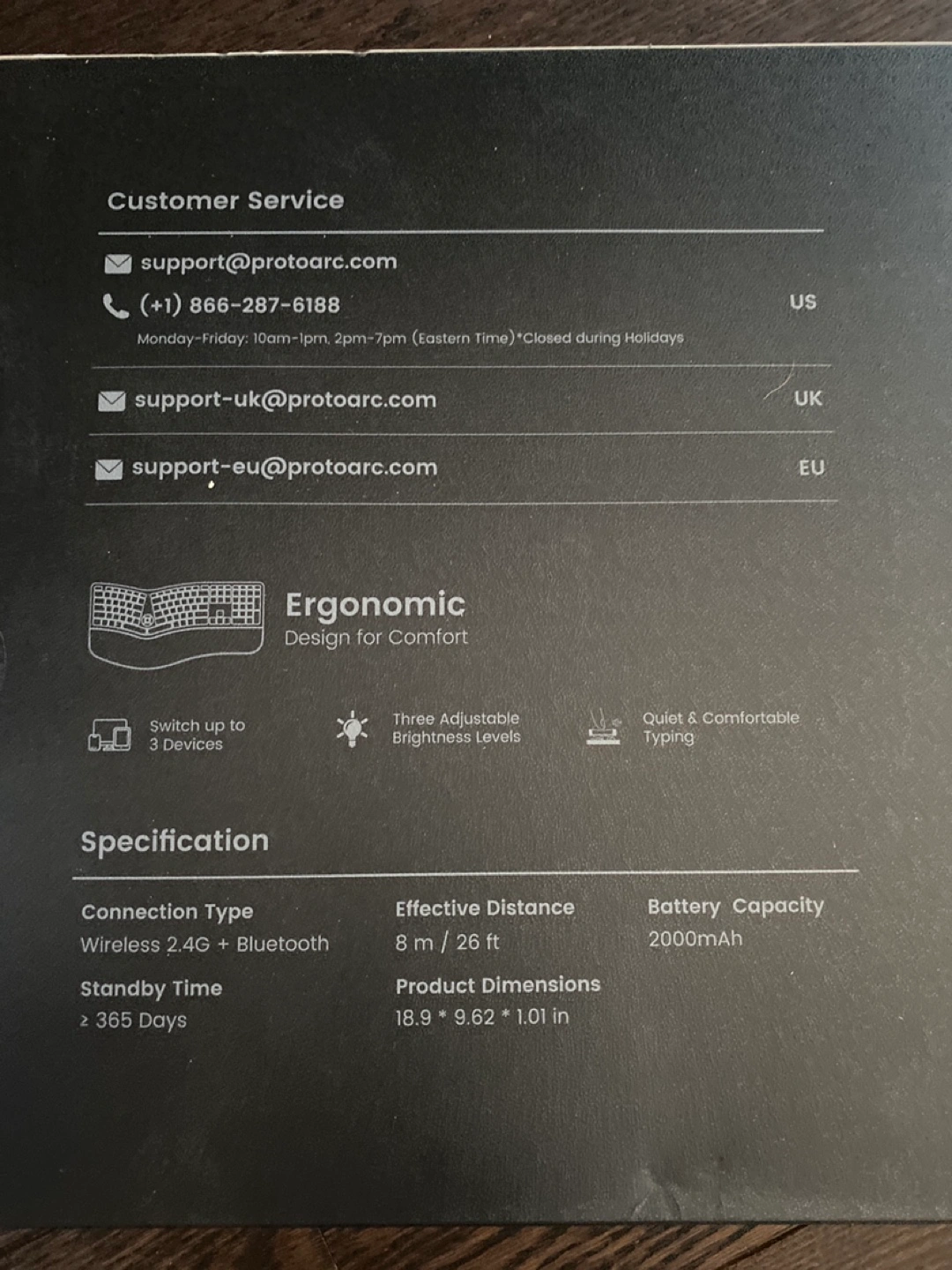 Wireless 2.4G + Bluetooth connection. Ergonomic design. Three adjustable brightness levels. Quiet and comfortable typing. 2000mAh battery. Standby time: 365 days. Full-size backlit design. Connects to up to 3 devices.