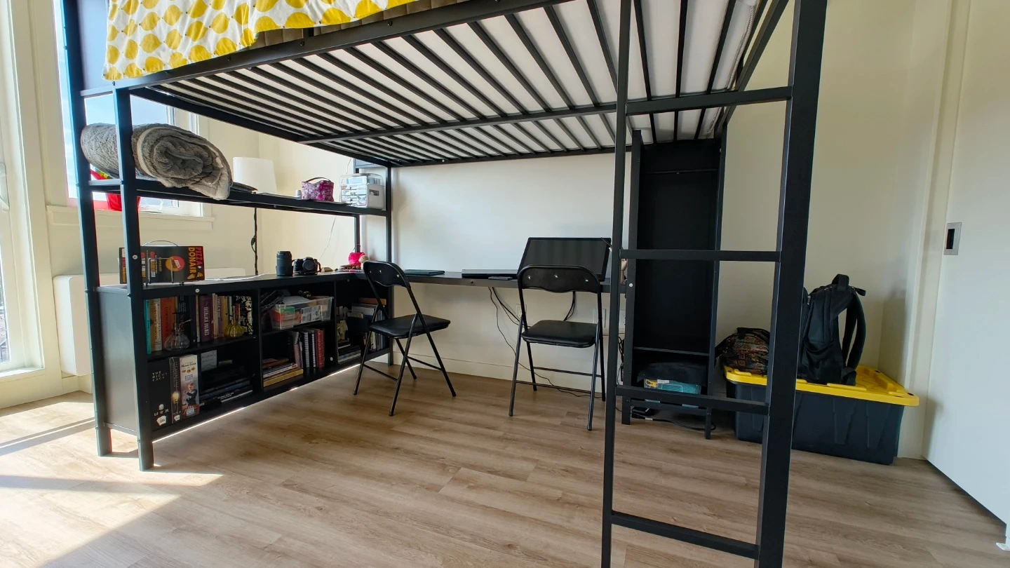 This black metal loft bed features a built-in desk and shelving unit, perfect for optimizing space. It's constructed with durable metal for long-lasting use. The integrated desk provides a functional workspace.