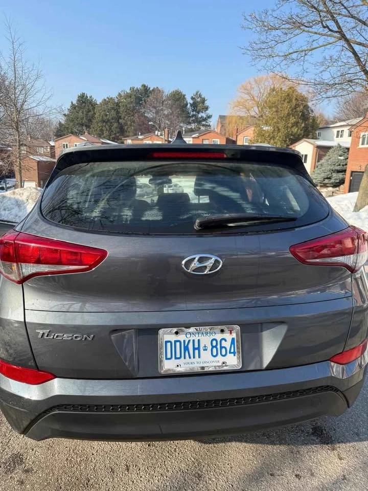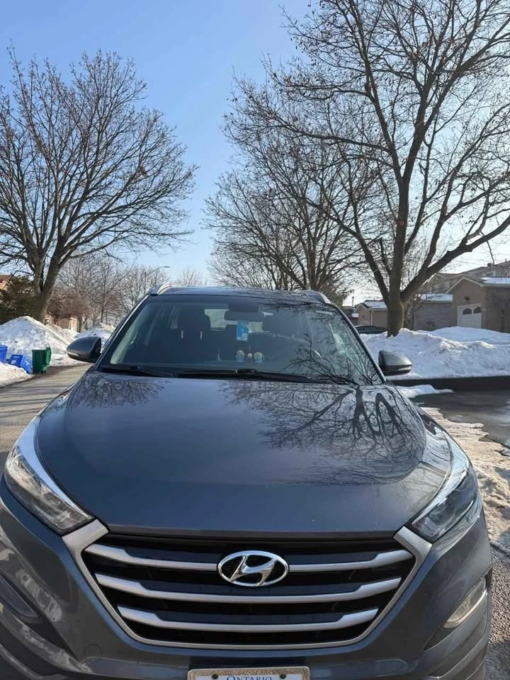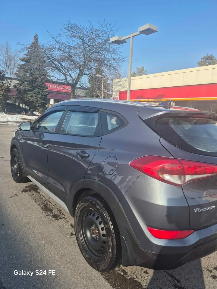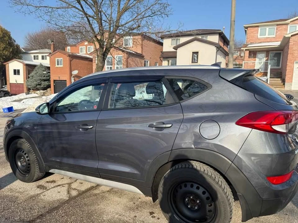 Spacious dark gray Hyundai Tucson SUV. Comes with winter tires on steel rims, ready for colder weather. Also includes roof rails and a car cover.