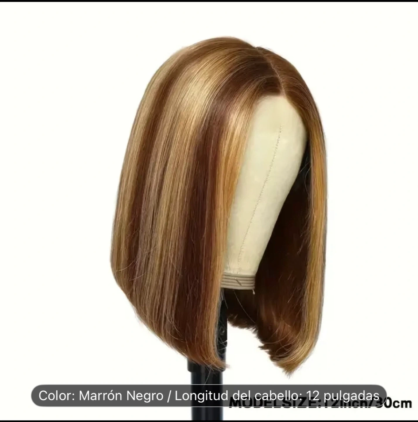 This is a 12-inch bob wig featuring a brown and black base with blonde highlights. The cap construction is shown in the images, with adjustable straps for a secure fit. It's designed for a natural look and easy styling!