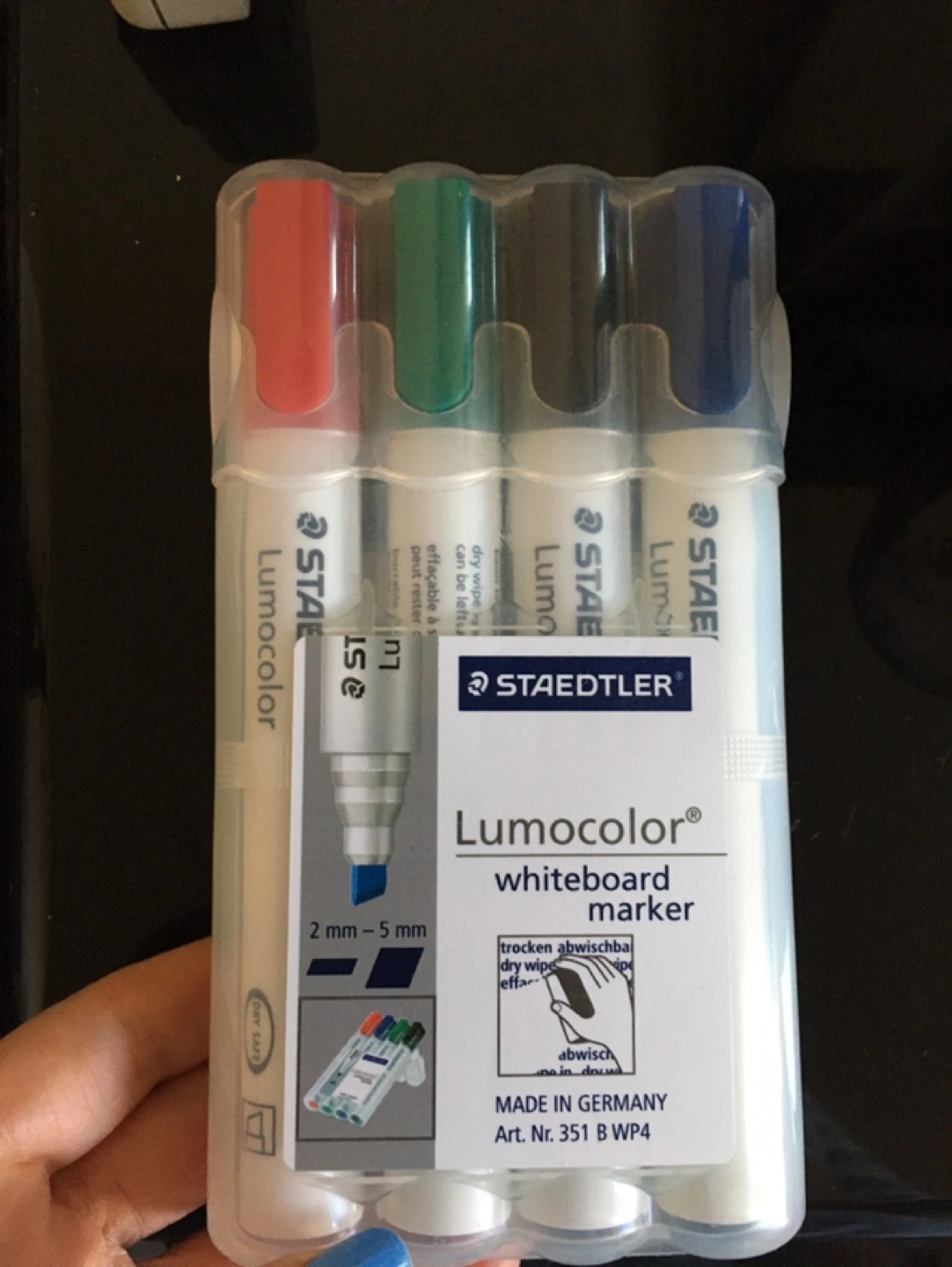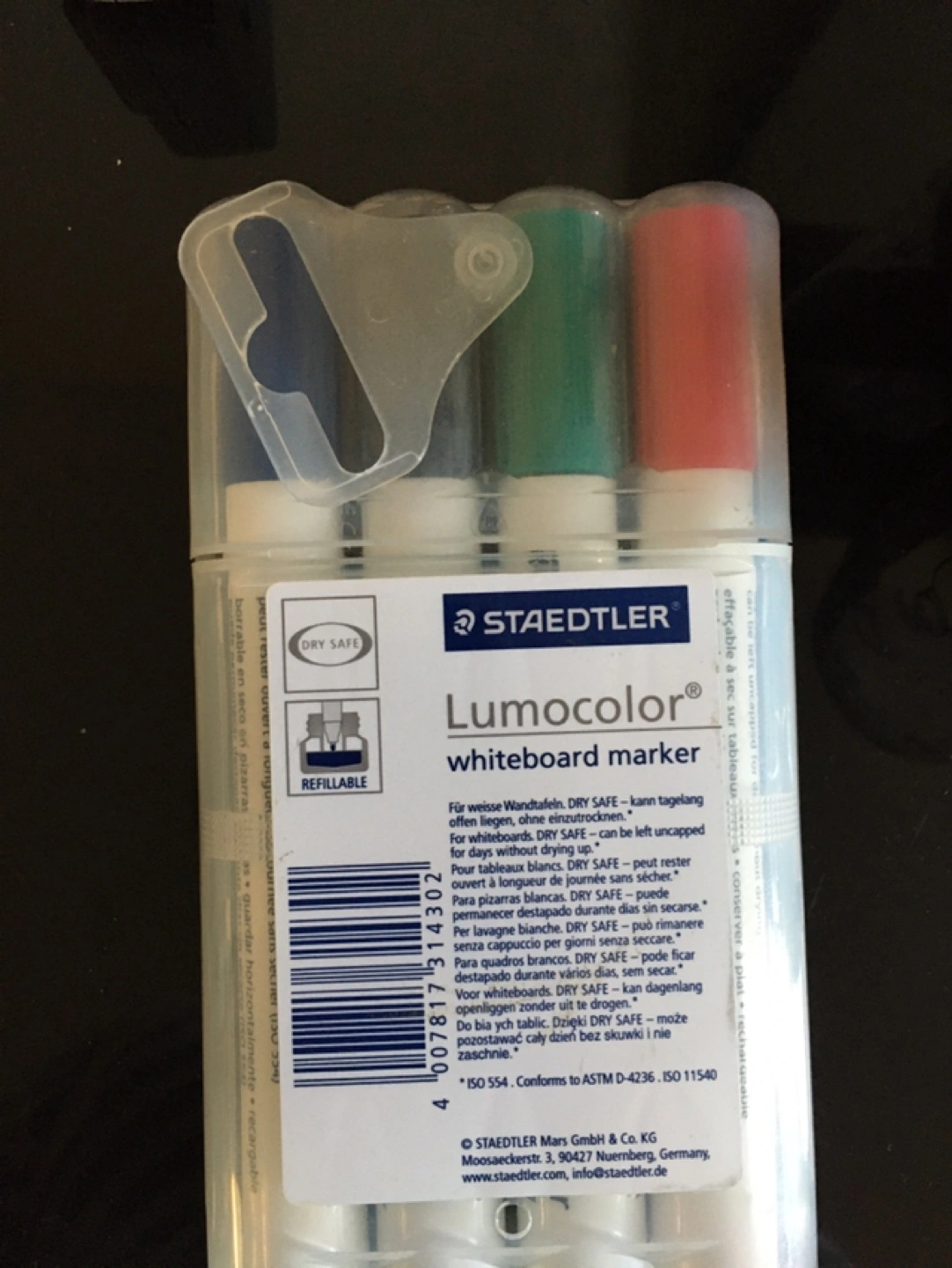 Set of four Staedtler Lumocolor whiteboard markers in various colours. They're designed for dry safe use and are refillable. The markers have a tip size between 2mm and 5mm.