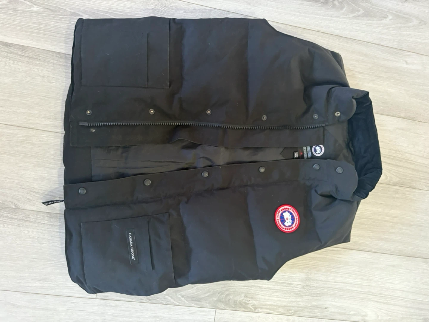 Canada Goose black down vest. It's a stylish and warm vest, perfect for layering during cooler weather. It's made with high-quality down for excellent insulation. This vest is great for anyone looking for a durable and fashionable outerwear piece.