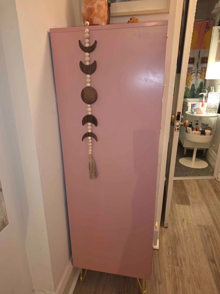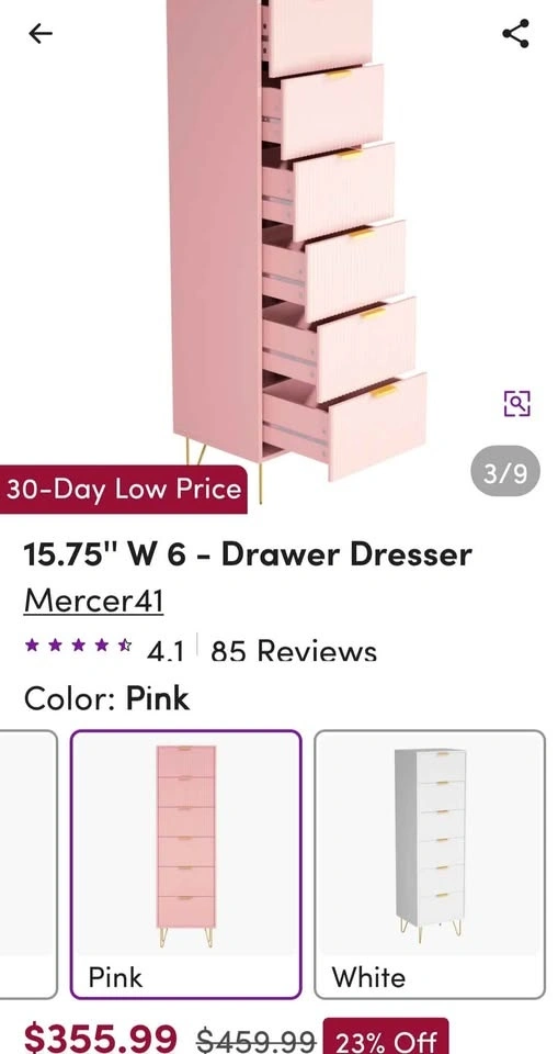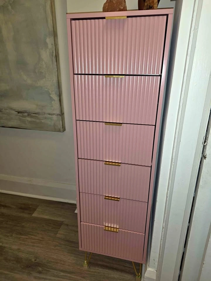 Cute pink tall dresser with five drawers. The drawer fronts have a cool ribbed design. Features gold bar handles and gold hairpin legs. Great storage piece, from Wayfair. Pick up Toronto Beaches Woodbine and Queen east.