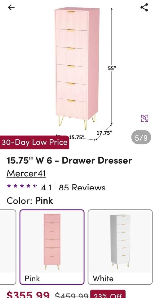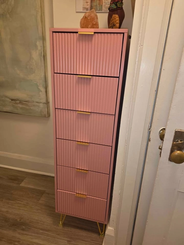 Cute pink tall dresser with five drawers. The drawer fronts have a cool ribbed design. Features gold bar handles and gold hairpin legs. Great storage piece, from Wayfair. Pick up Toronto Beaches Woodbine and Queen east.