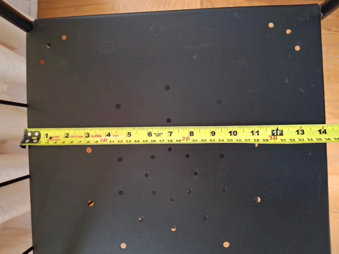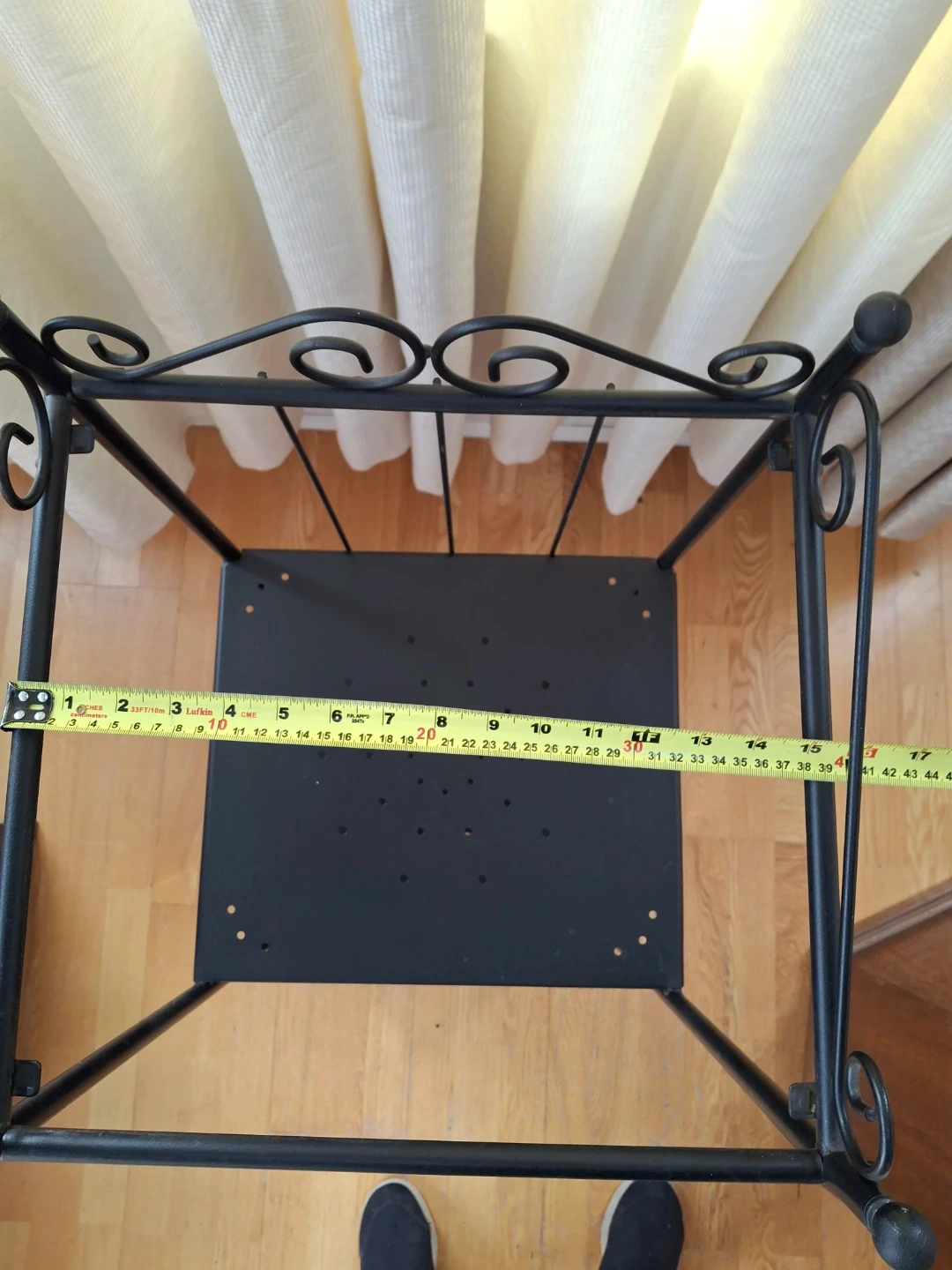 Here's a handy black metal shelf with three tiers! All three shelves are removable. It's perfect for adding some extra storage or display space to any room. The shelf measures about 14 inches wide and 16 inches deep, so it's a great size for fitting into smaller spaces. It's in great condition and ready to find a new home. Make me an offer