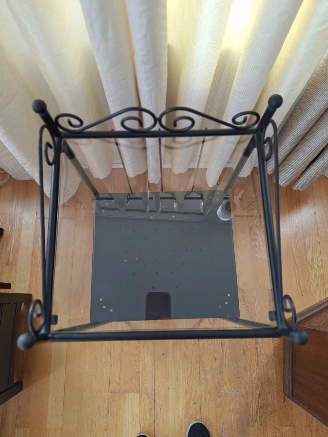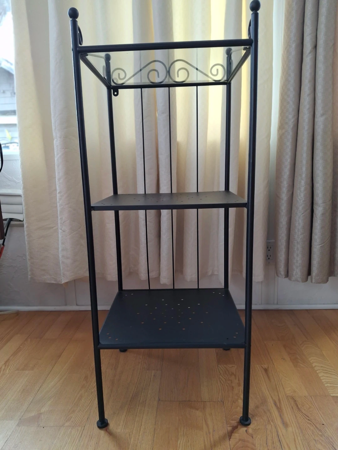 Black Metal 3-Tier Shelf. Top shelf is glass