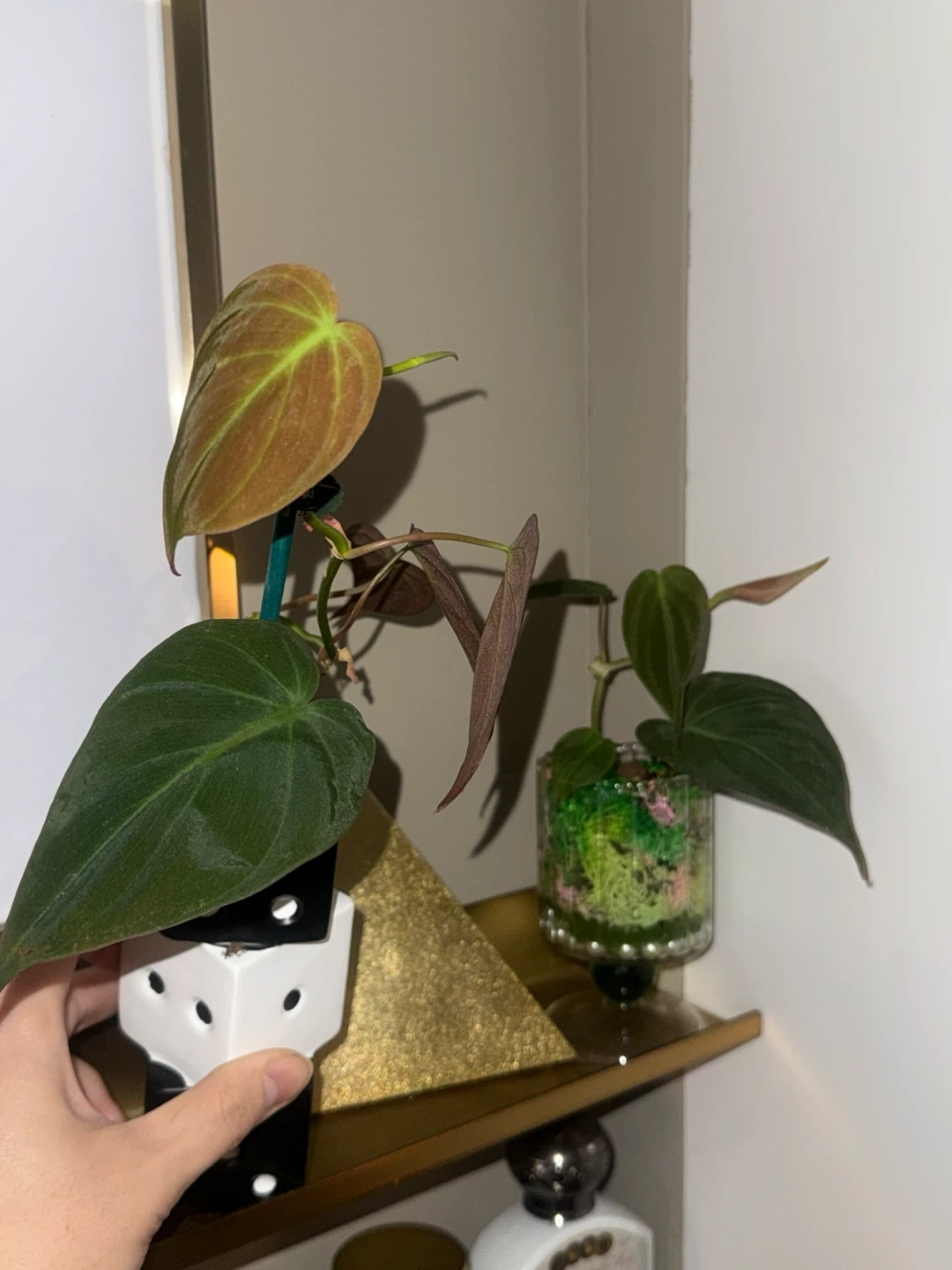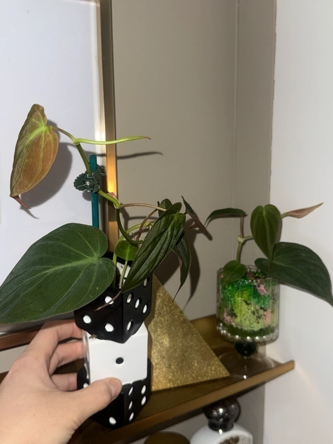 a healthy philodendron micans plant potted in a unique Stacked Dice Planter Pot. It's having beautiful dark green velvety leaves could be a good upgraded option to pothos or other regular hanging plants. The whole set would def add a touch of edginess to any space. Pick up from queens elmhurst.