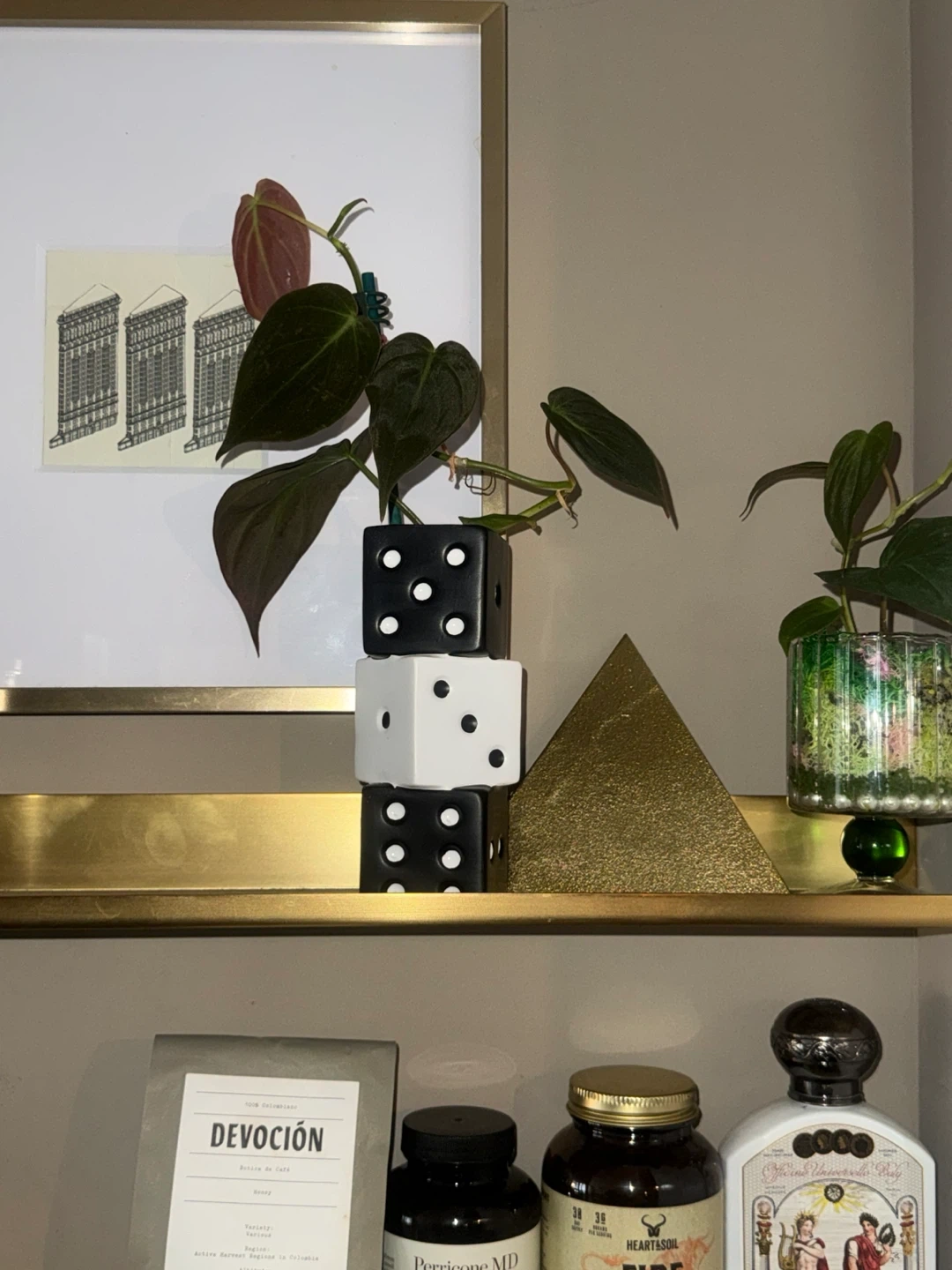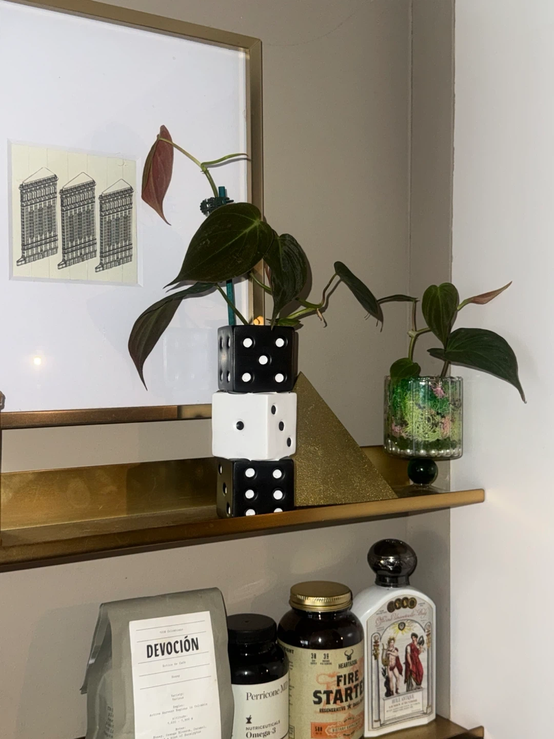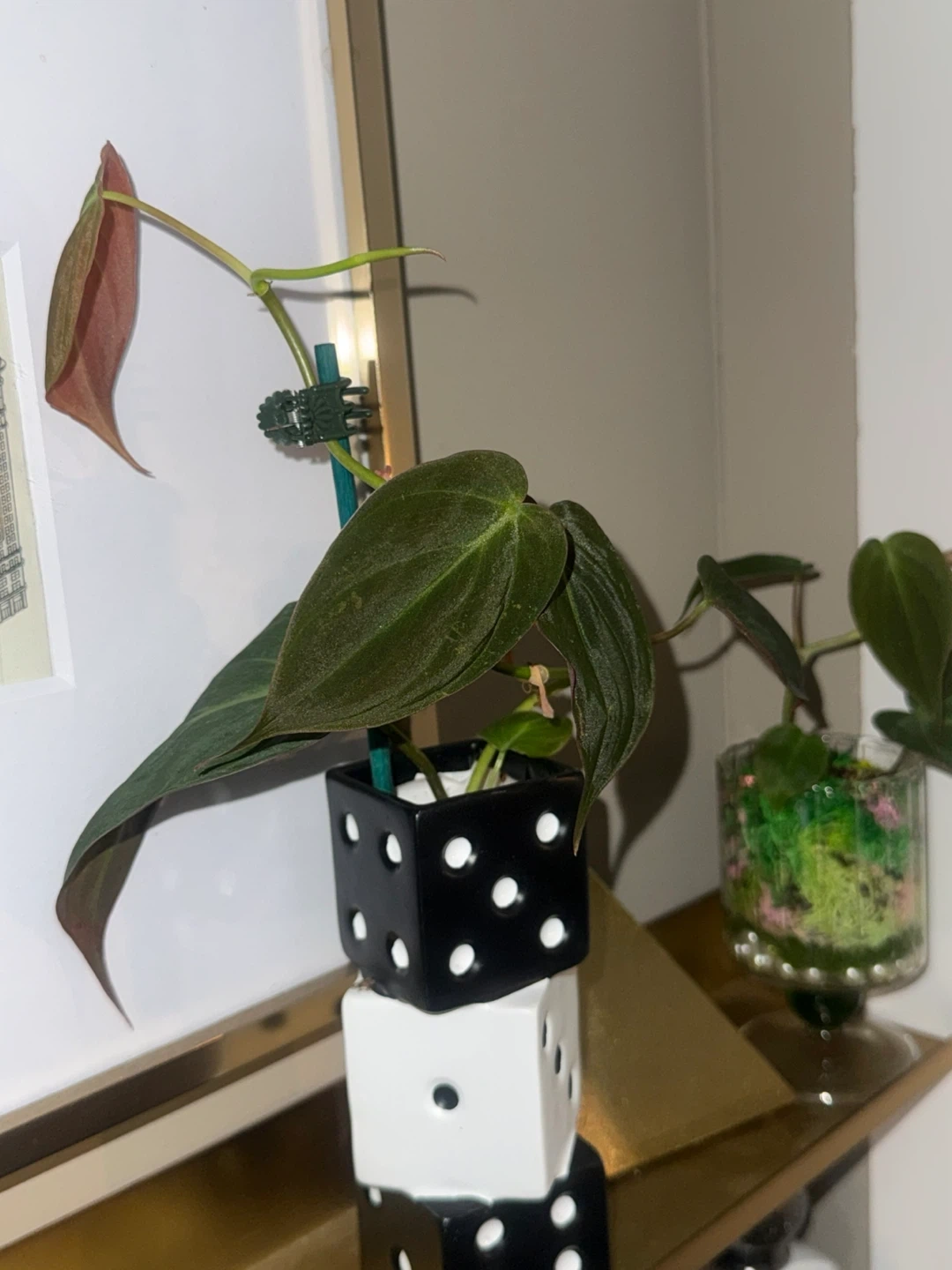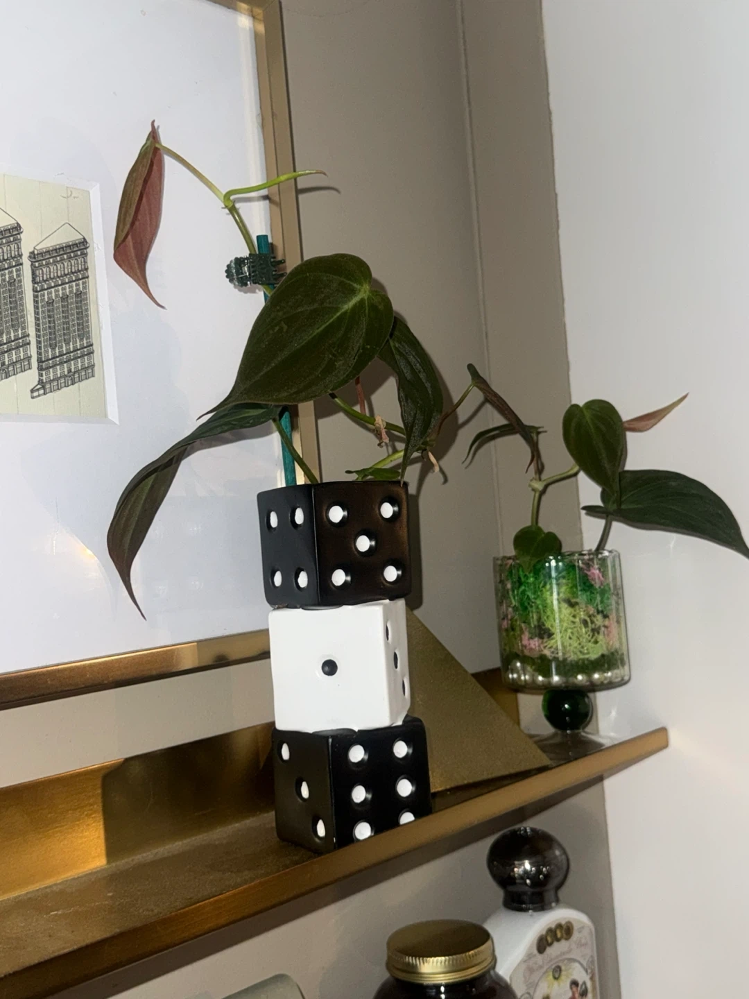 a healthy philodendron micans plant potted in a unique Stacked Dice Planter Pot. It's having beautiful dark green velvety leaves could be a good upgraded option to pothos or other regular hanging plants. The whole set would def add a touch of edginess to any space. Pick up from queens elmhurst.