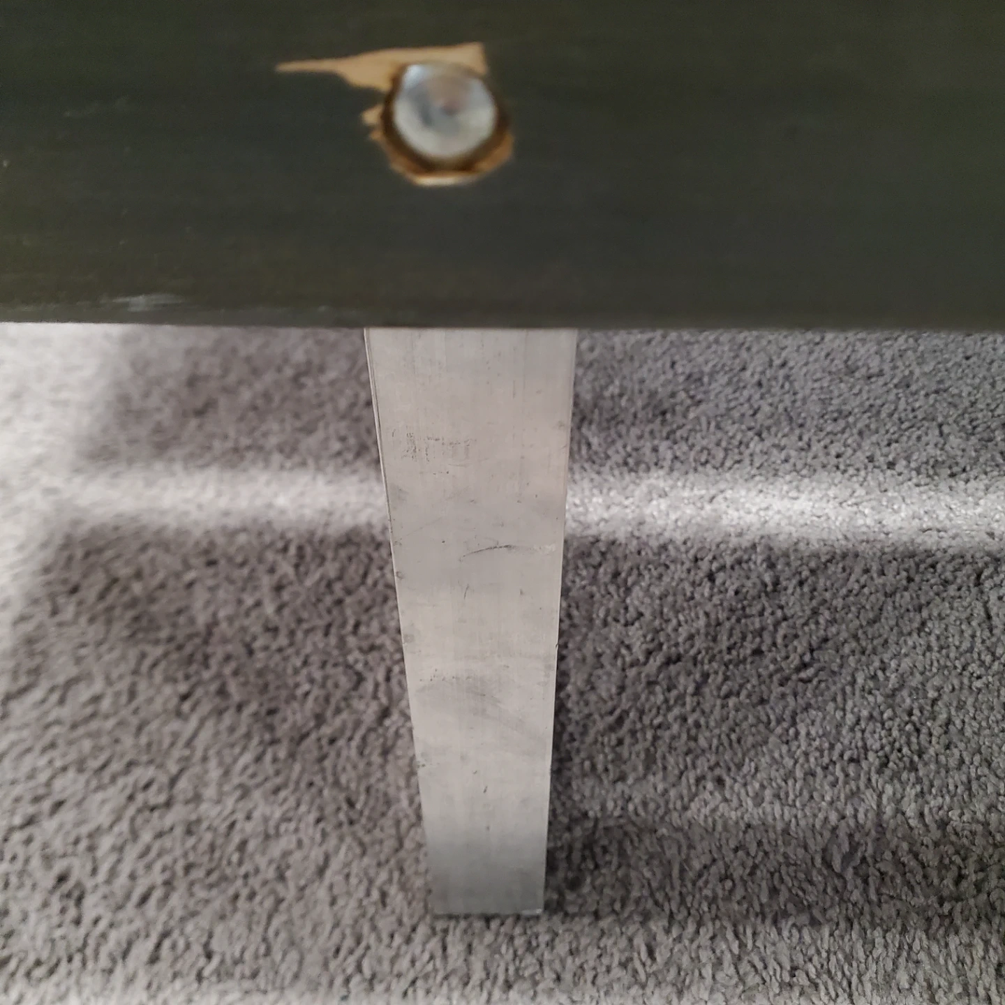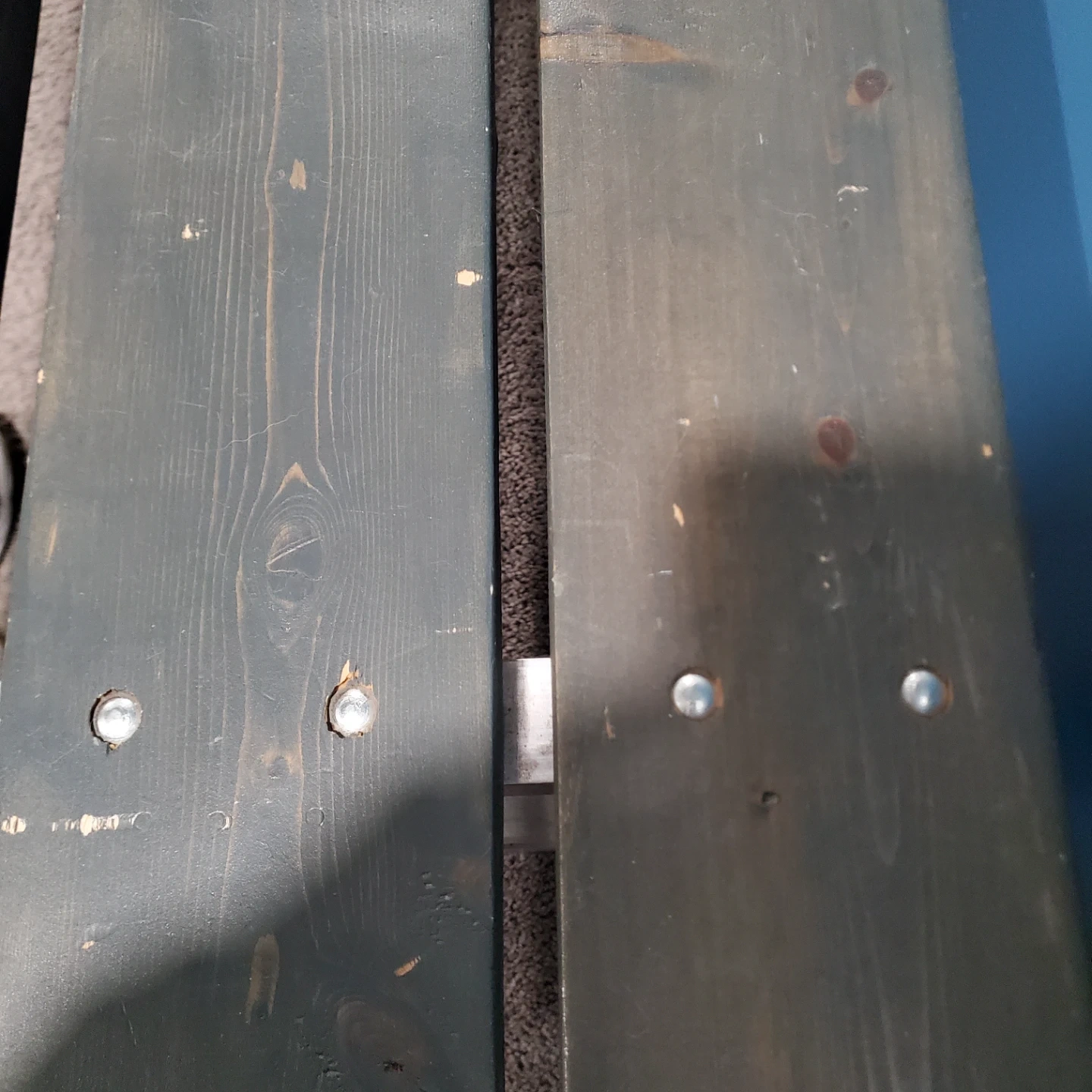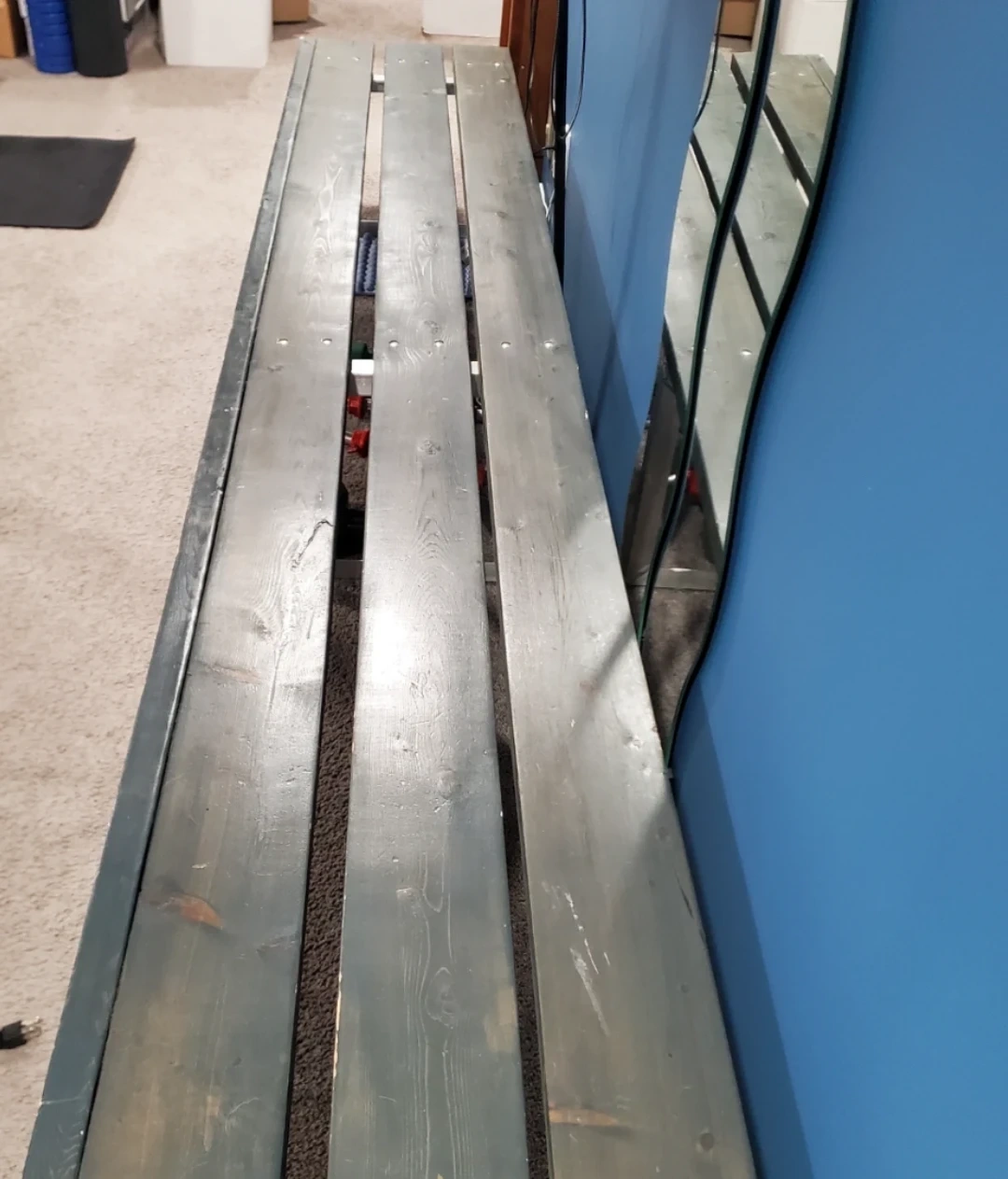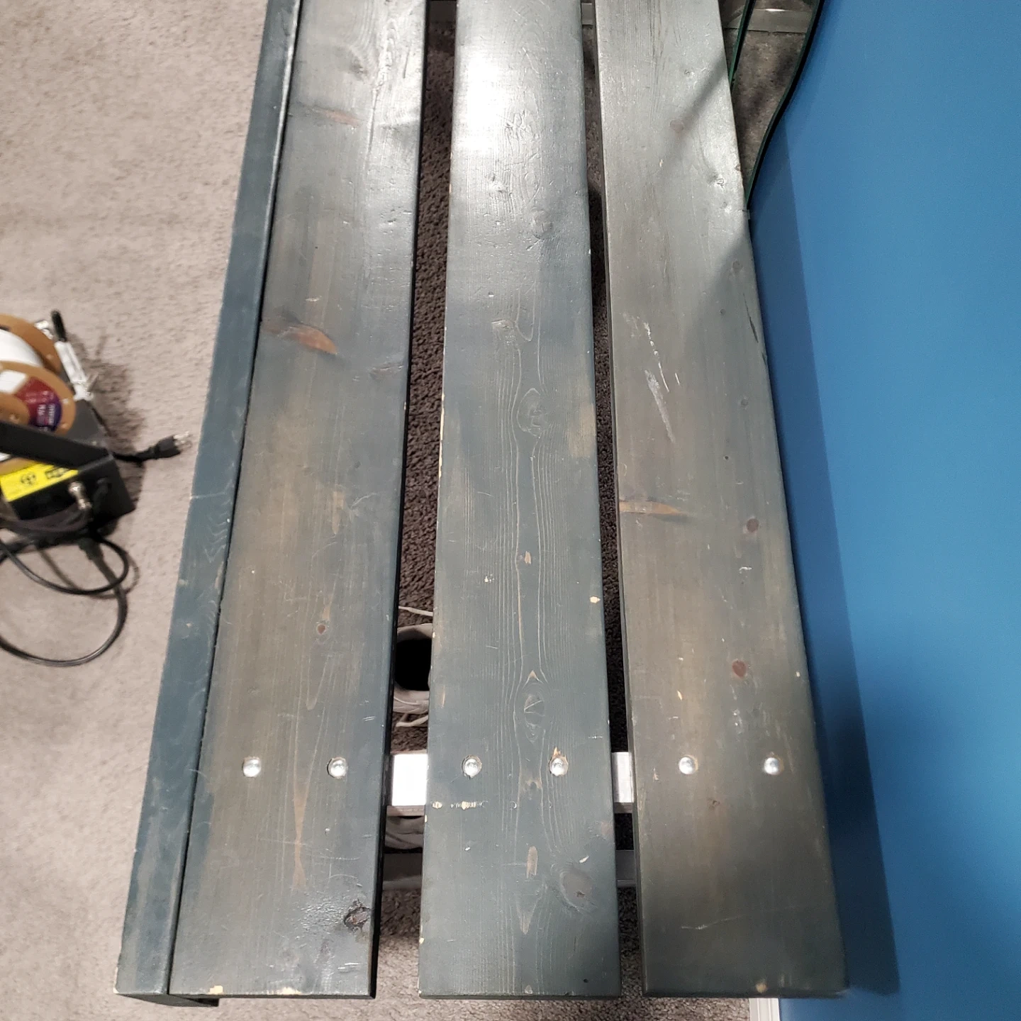 A long wooden bench with a grey metal legs. It's constructed with three wooden planks.This bench would be useful for seating in an entryway or covered porch. Measurements are 10ft. Long by 19 3/8" wide and 16 3/8" tall. I can provide new pads that stick to the feet if wanted. I have one built and one already dismantled so you can decide which is better for transport.