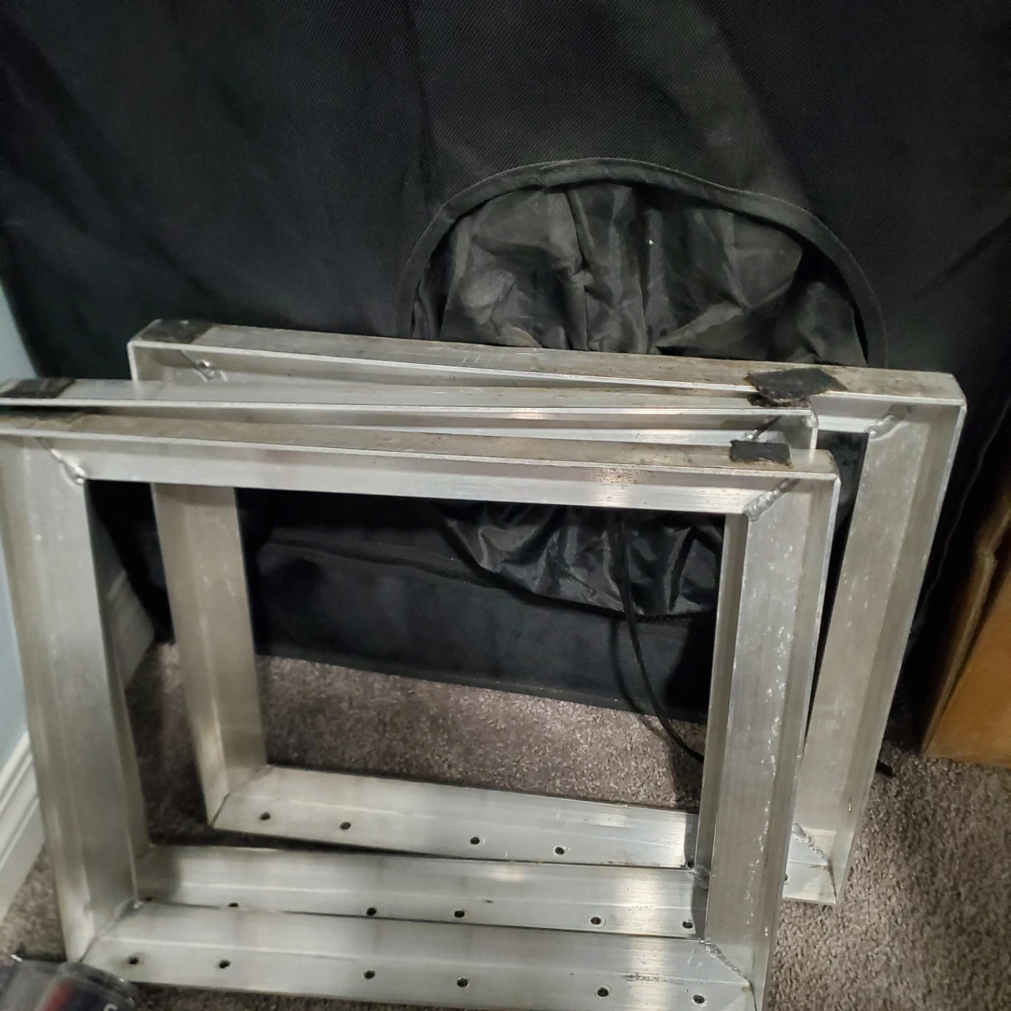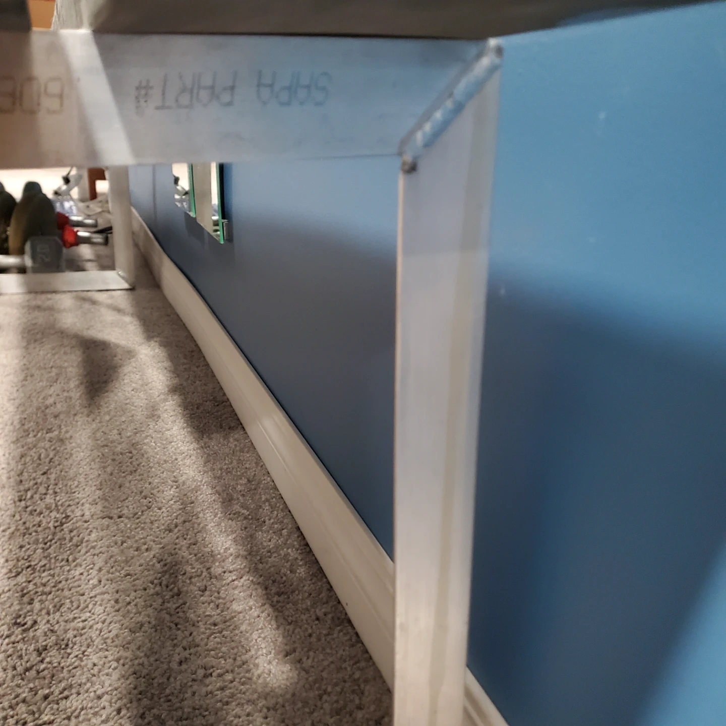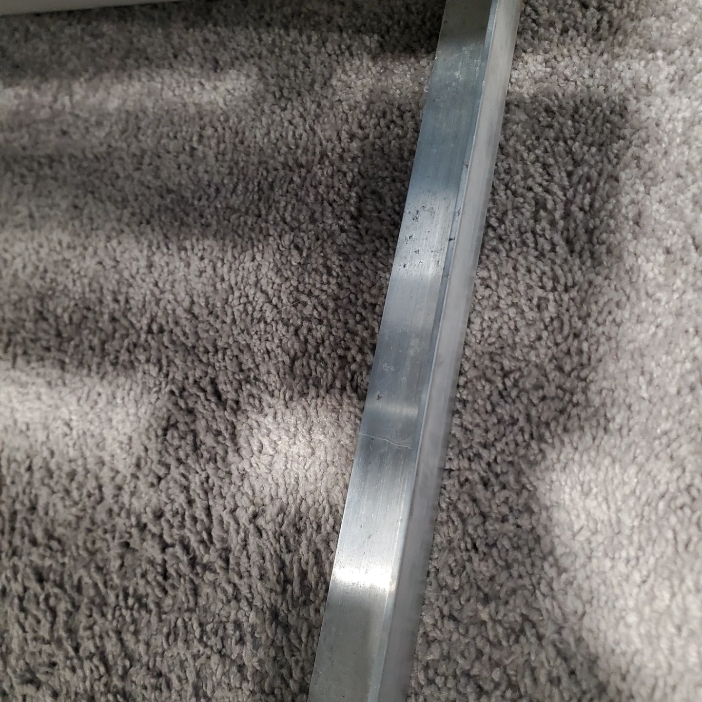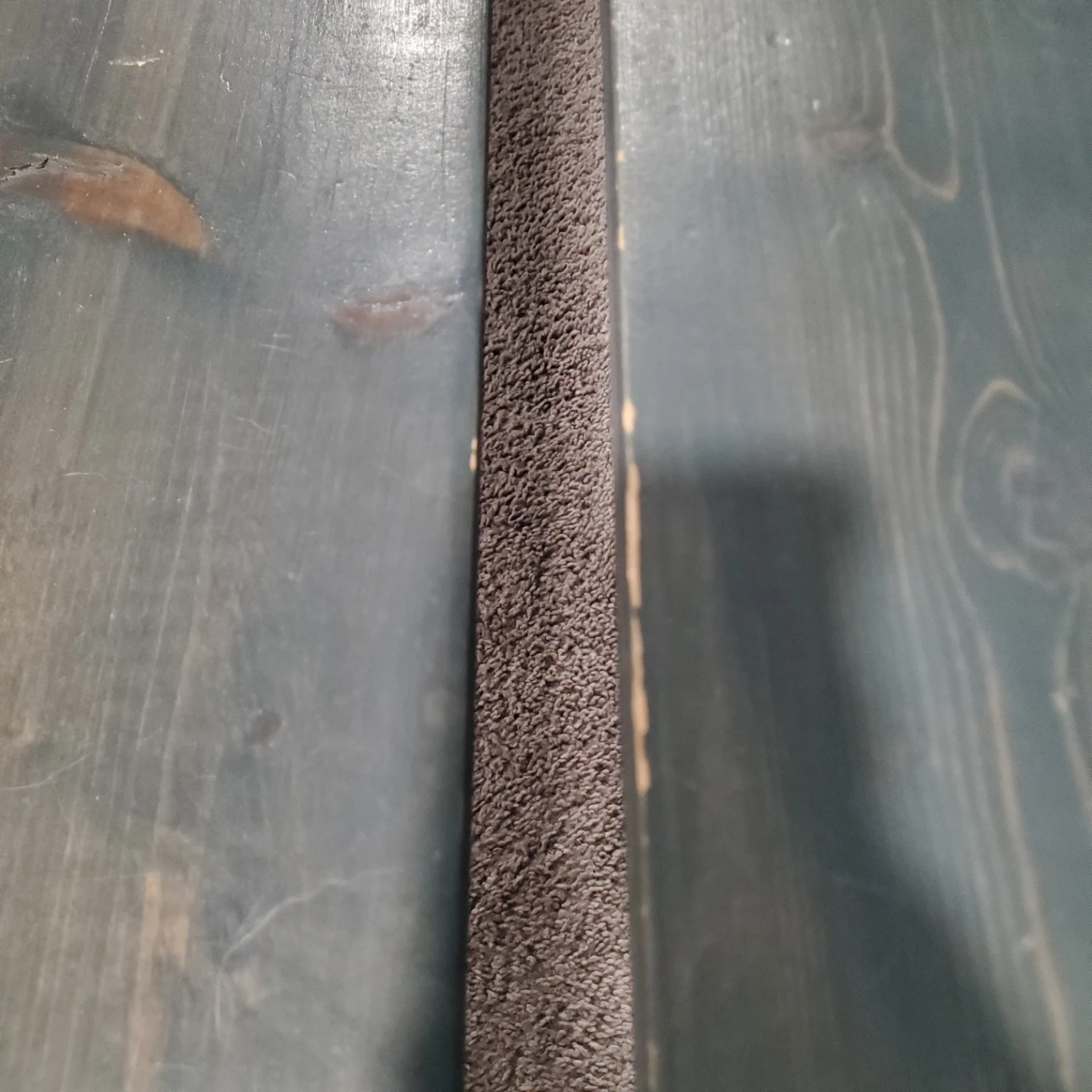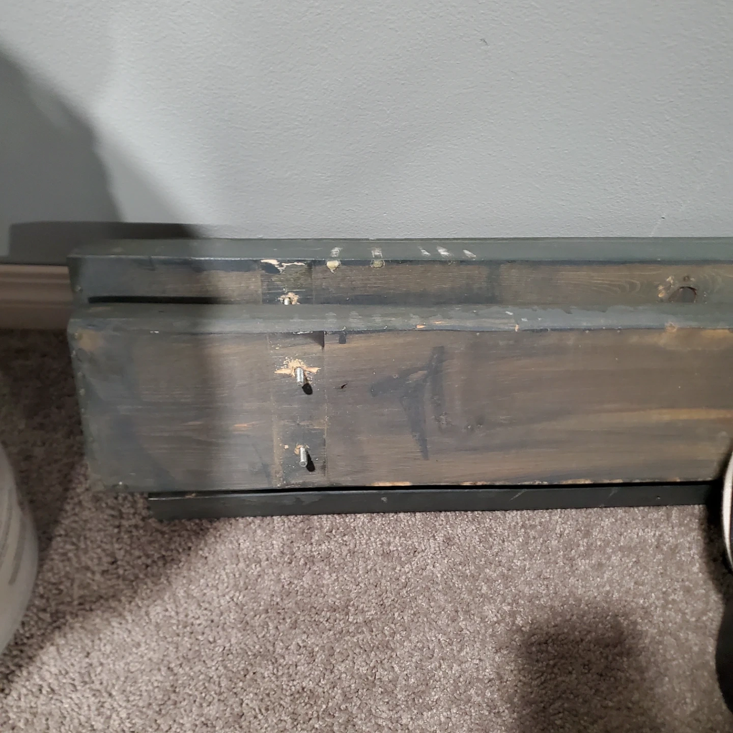 A long wooden bench with a grey metal legs. It's constructed with three wooden planks.This bench would be useful for seating in an entryway or covered porch. Measurements are 10ft. Long by 19 3/8" wide and 16 3/8" tall. I can provide new pads that stick to the feet if wanted. I have one built and one already dismantled so you can decide which is better for transport.
