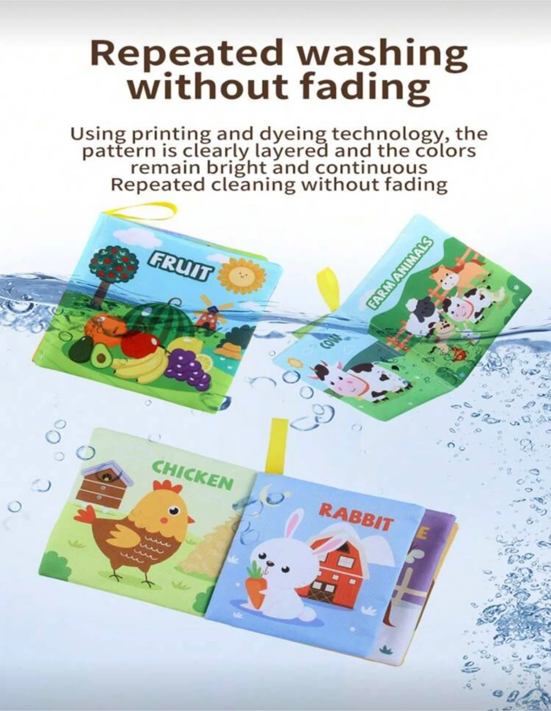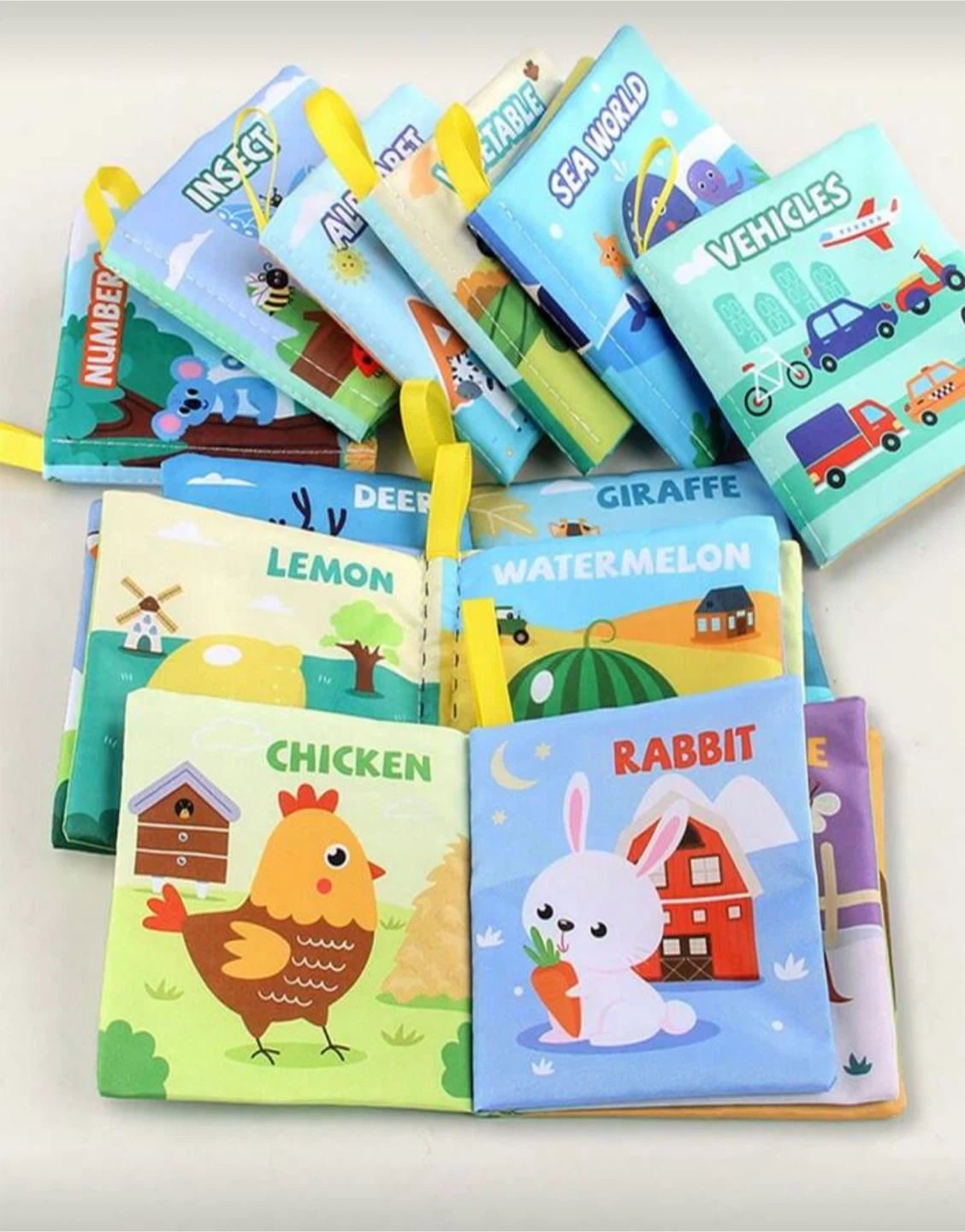 New Set of 9 Baby Soft Cloth Books - Animals, Fruits, Vehicles & More! This set includes nine colourful soft cloth books for babies and toddlers. Each book features bright illustrations and simple text on various themes like animals, fruits, and vehicles. They're washable and designed for repeated cleaning without fading, making them a durable and engaging early learning toy.