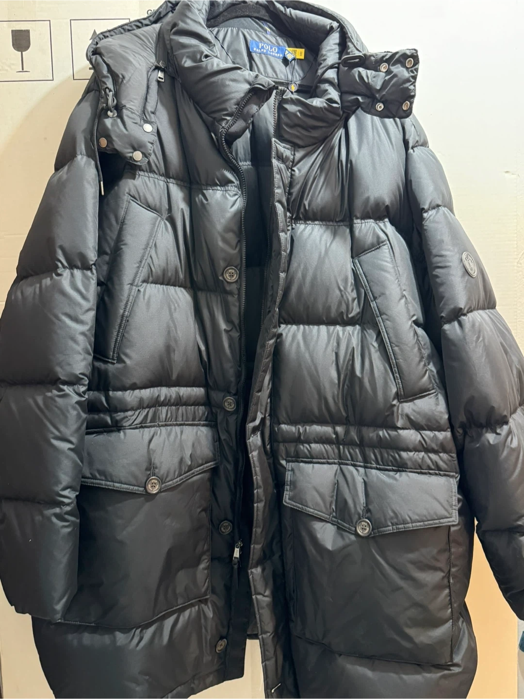 Selling a Polo Ralph Lauren black puffer jacket! It's in great condition and ready to keep you warm. The jacket features a hood and multiple pockets for your convenience. Perfect for the colder months!