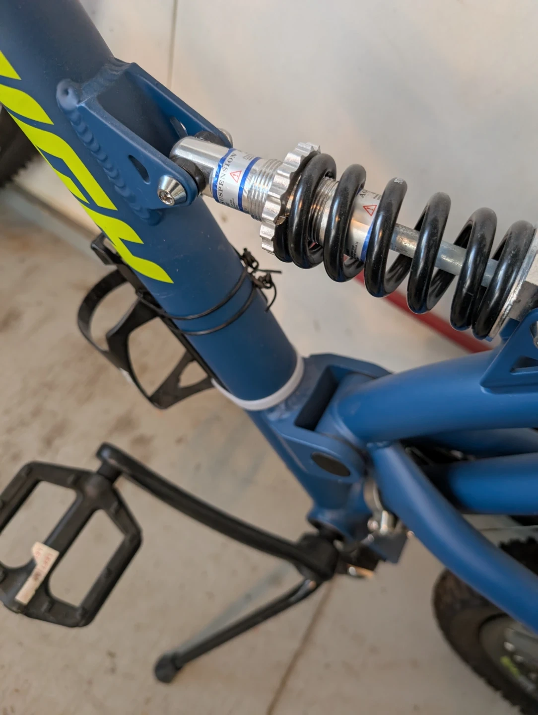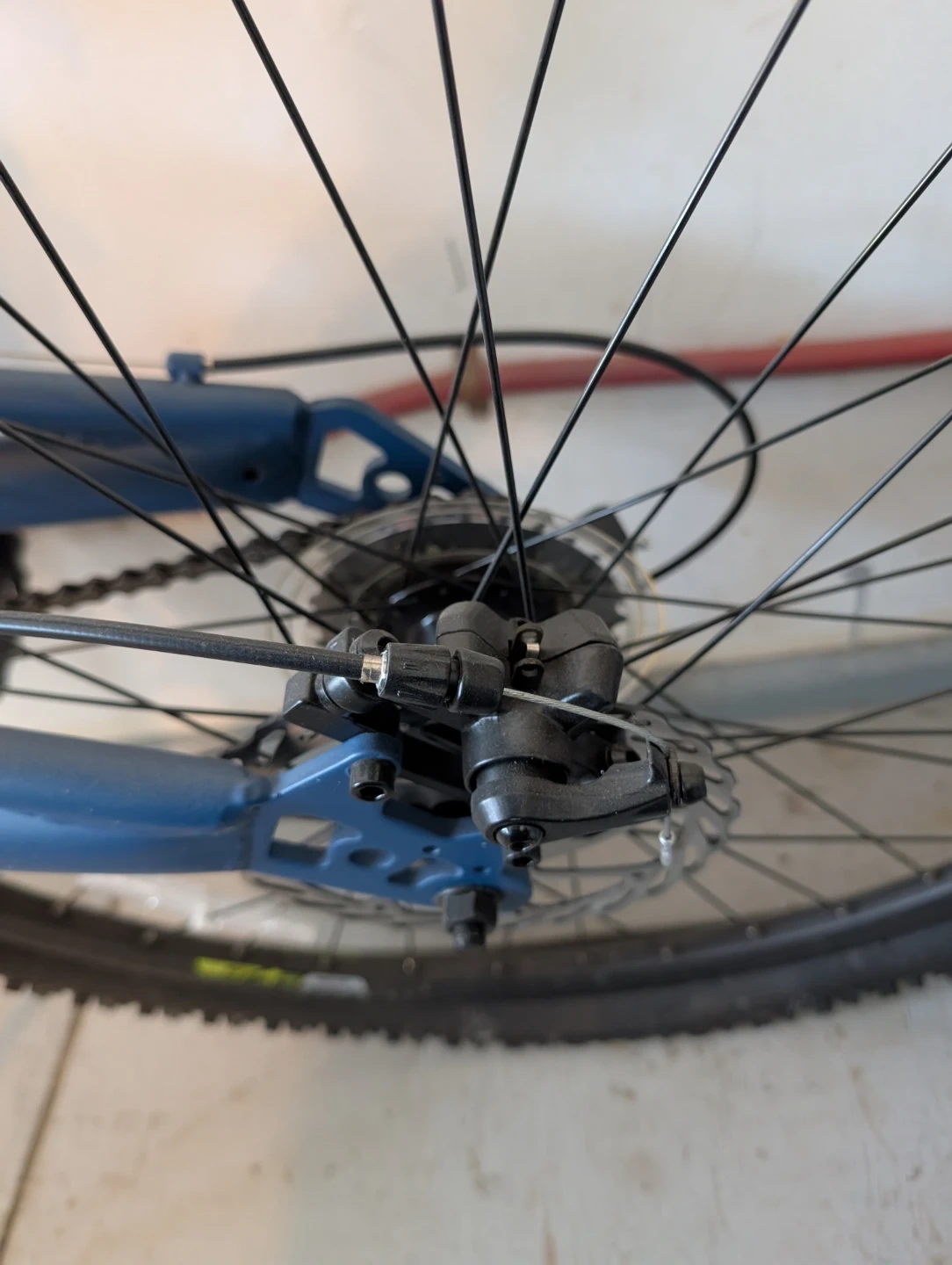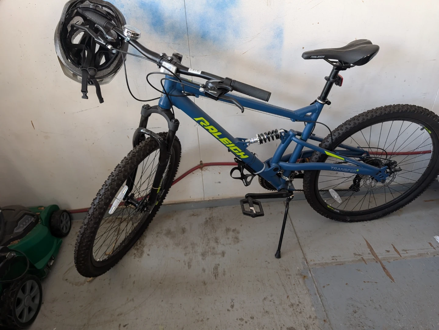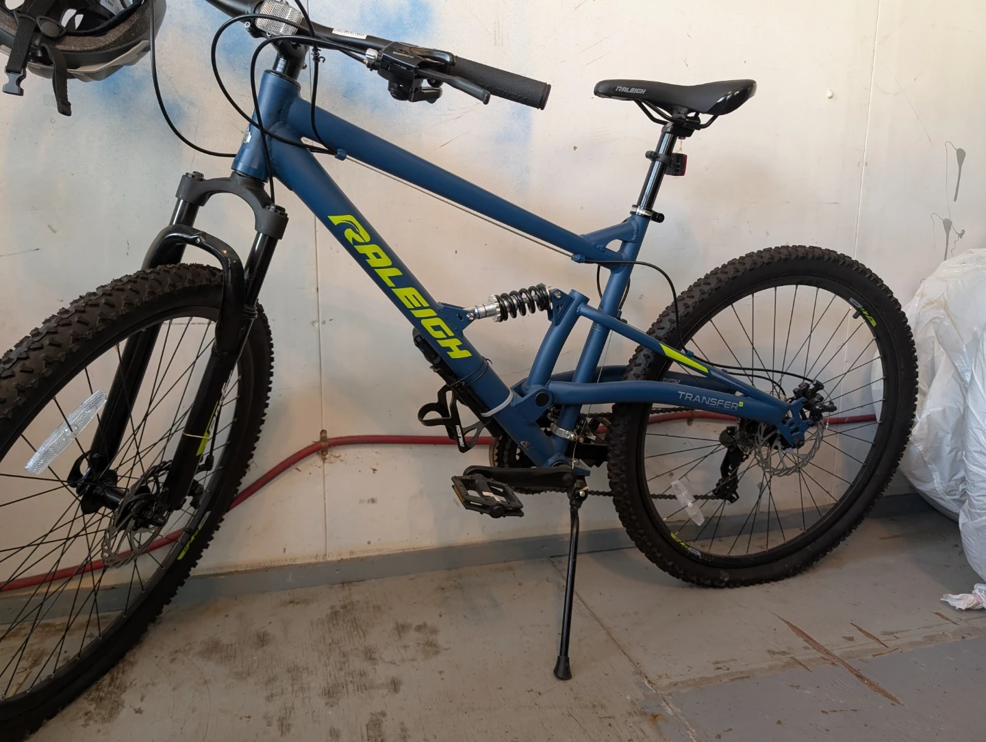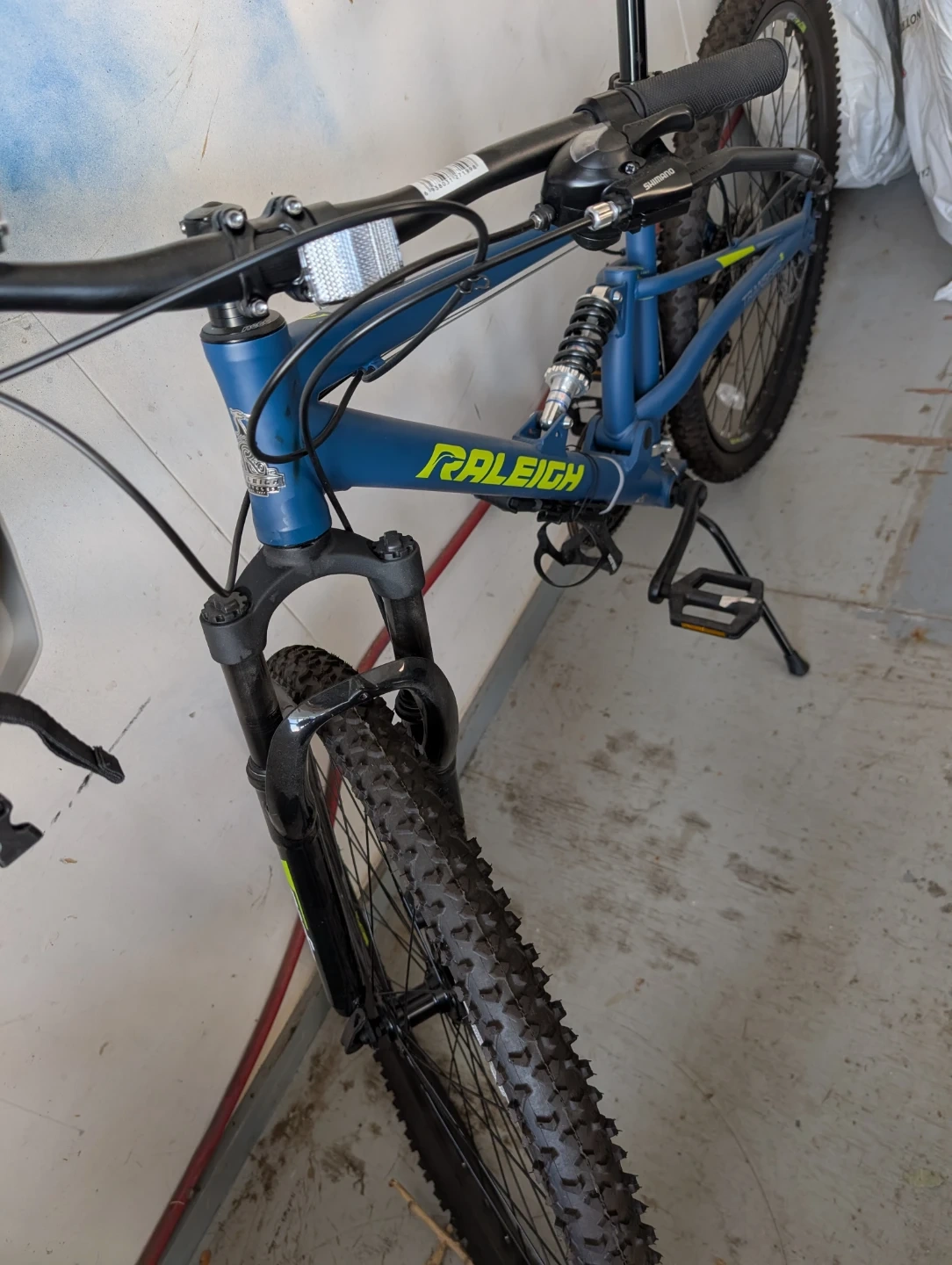This is a blue Raleigh full suspension mountain bike with disc brakes. It's a great bike for hitting the trails or just cruising around town. The bike features a durable frame and reliable components.