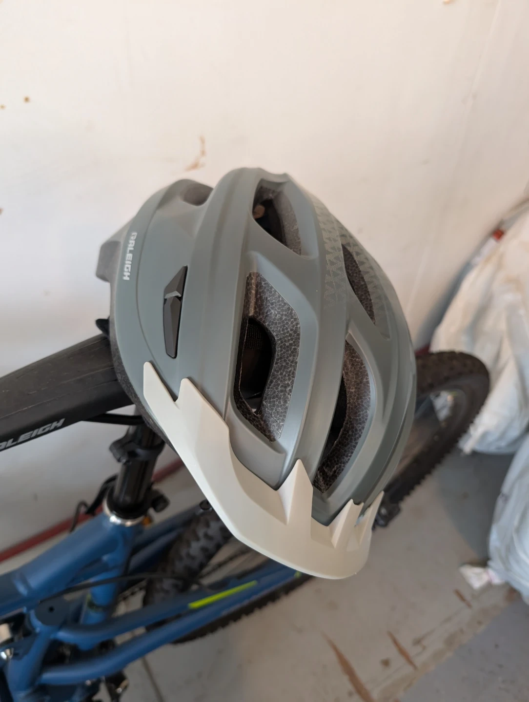 Includes accessories: pump, bottle cage, bell, and helmet — all Raleigh.