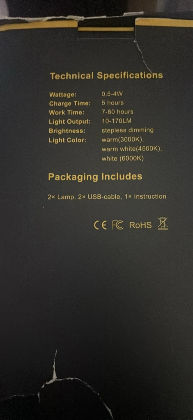 This is a JoyFulbid smart table lamp. It features stepless dimming with warm (3000K), warm white (4500K), and white (6000K) light options. Charge time is 5 hours, with a work time of 7-60 hours. Packaging includes 2 lamps, 2 USB cables, and 1 instruction manual.