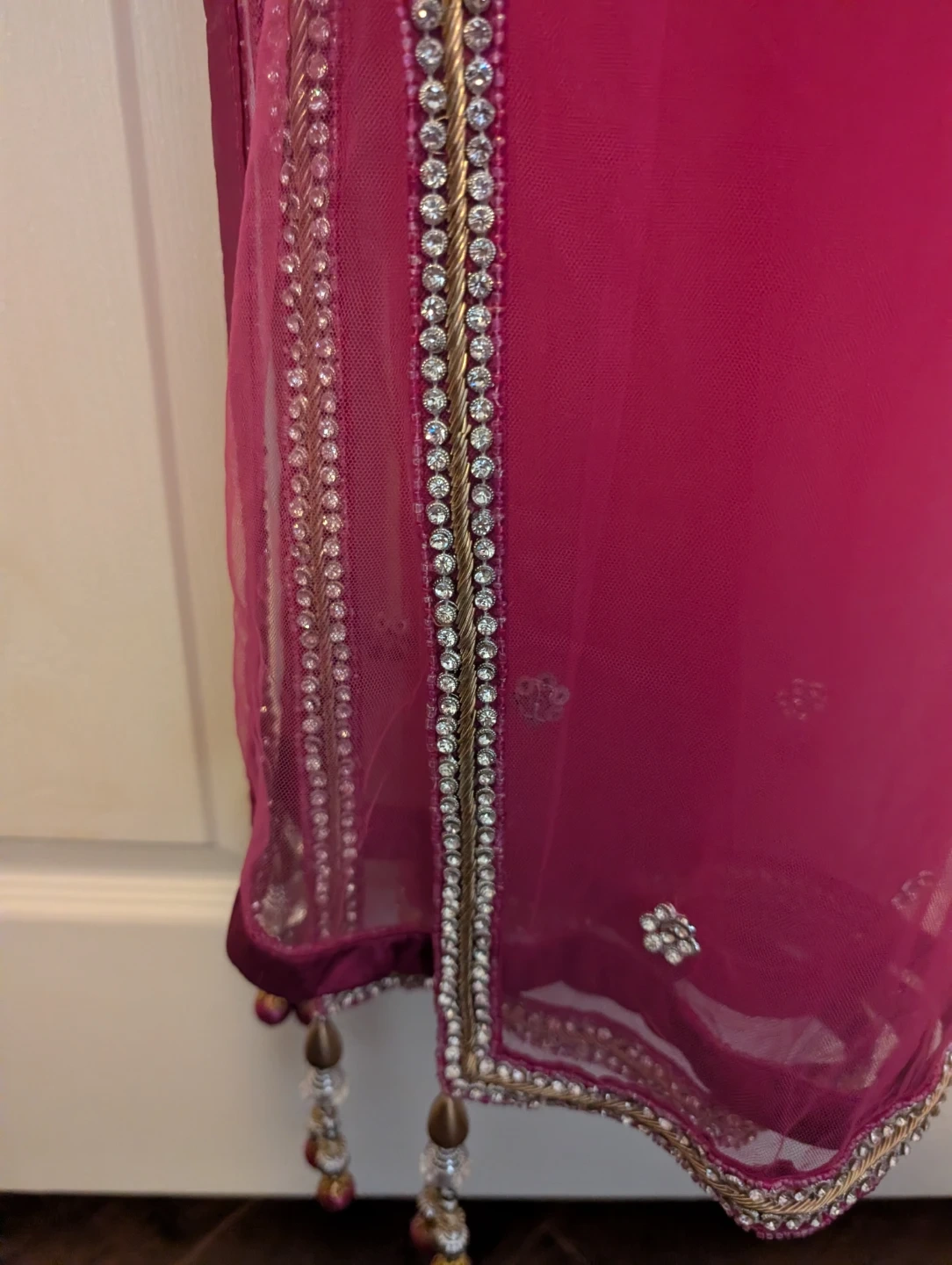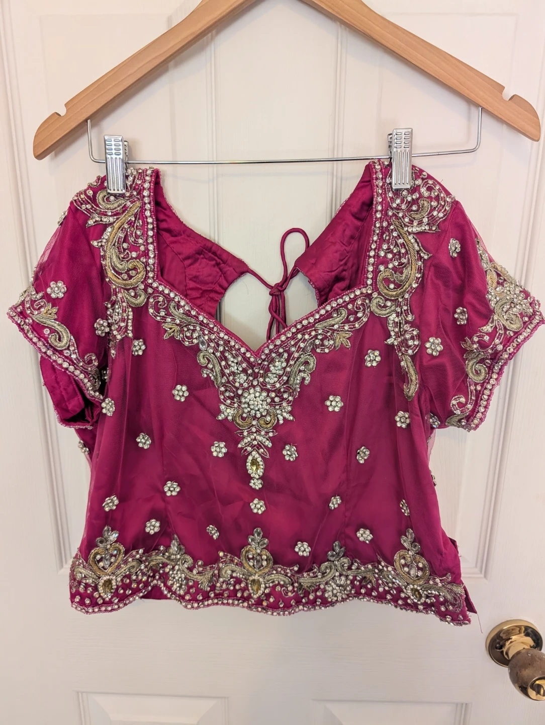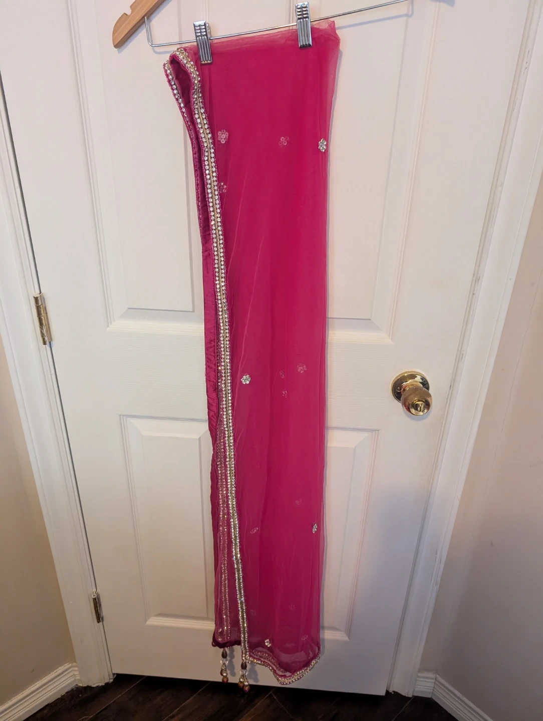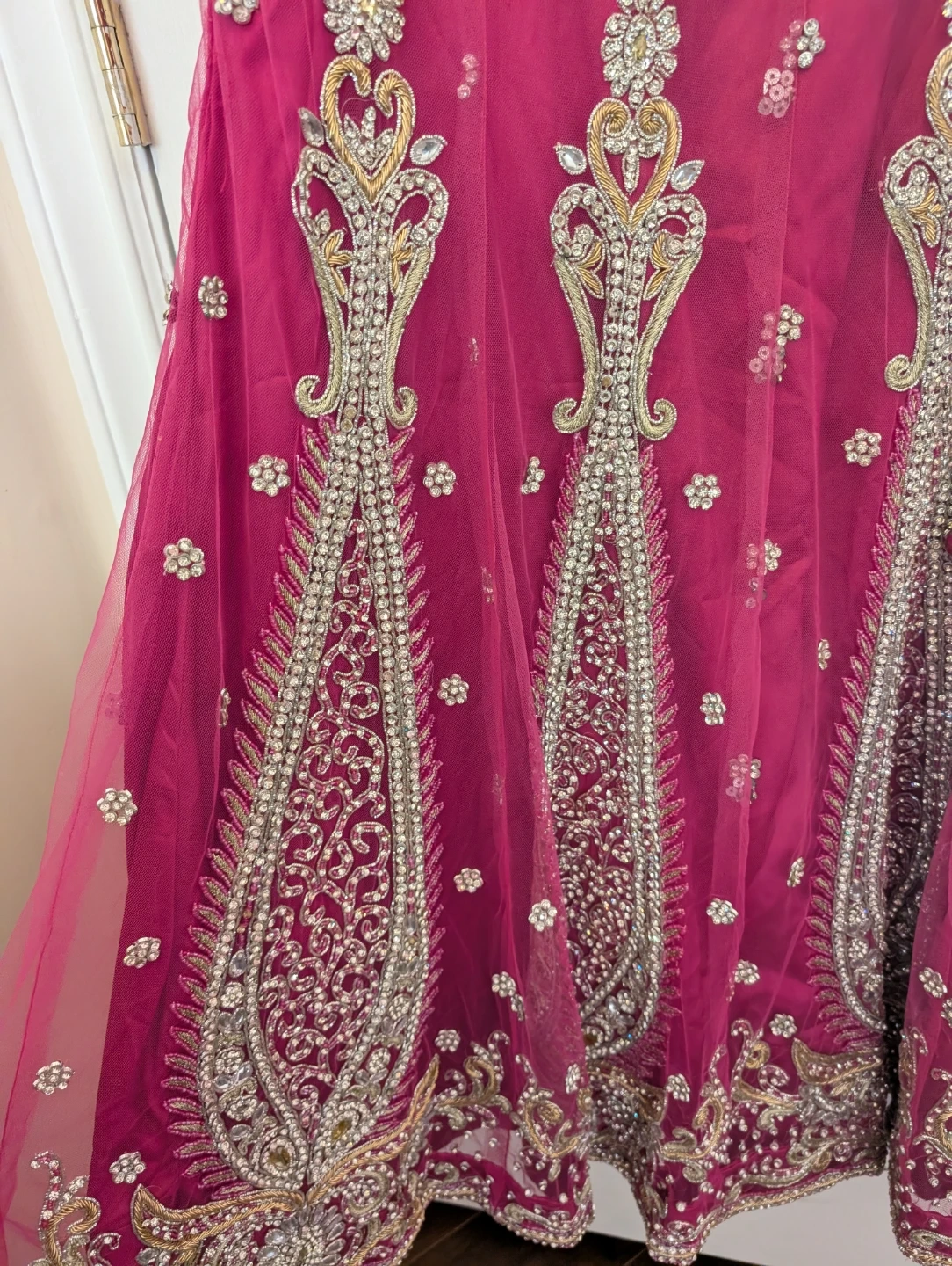 A vibrant pink lehenga choli set adorned with intricate embroidery and beadwork. The set includes a decorative blouse and a flowing mermaid style skirt.