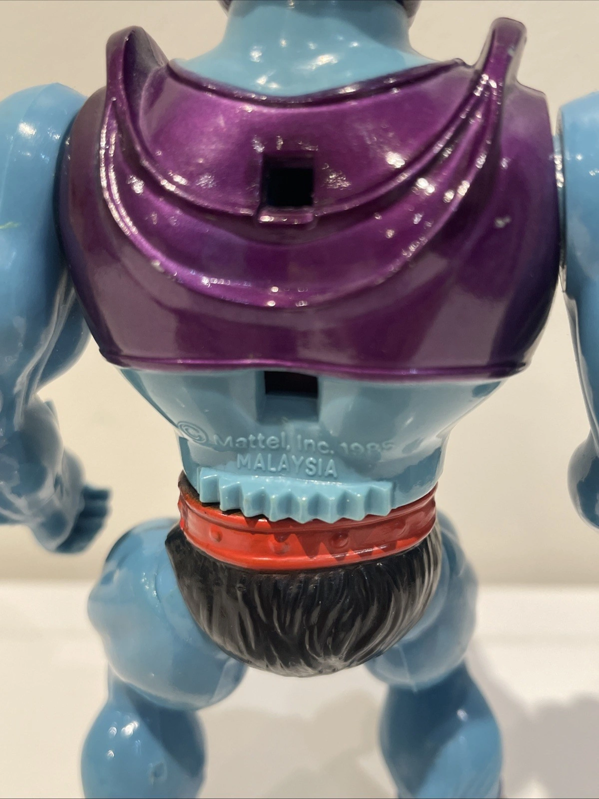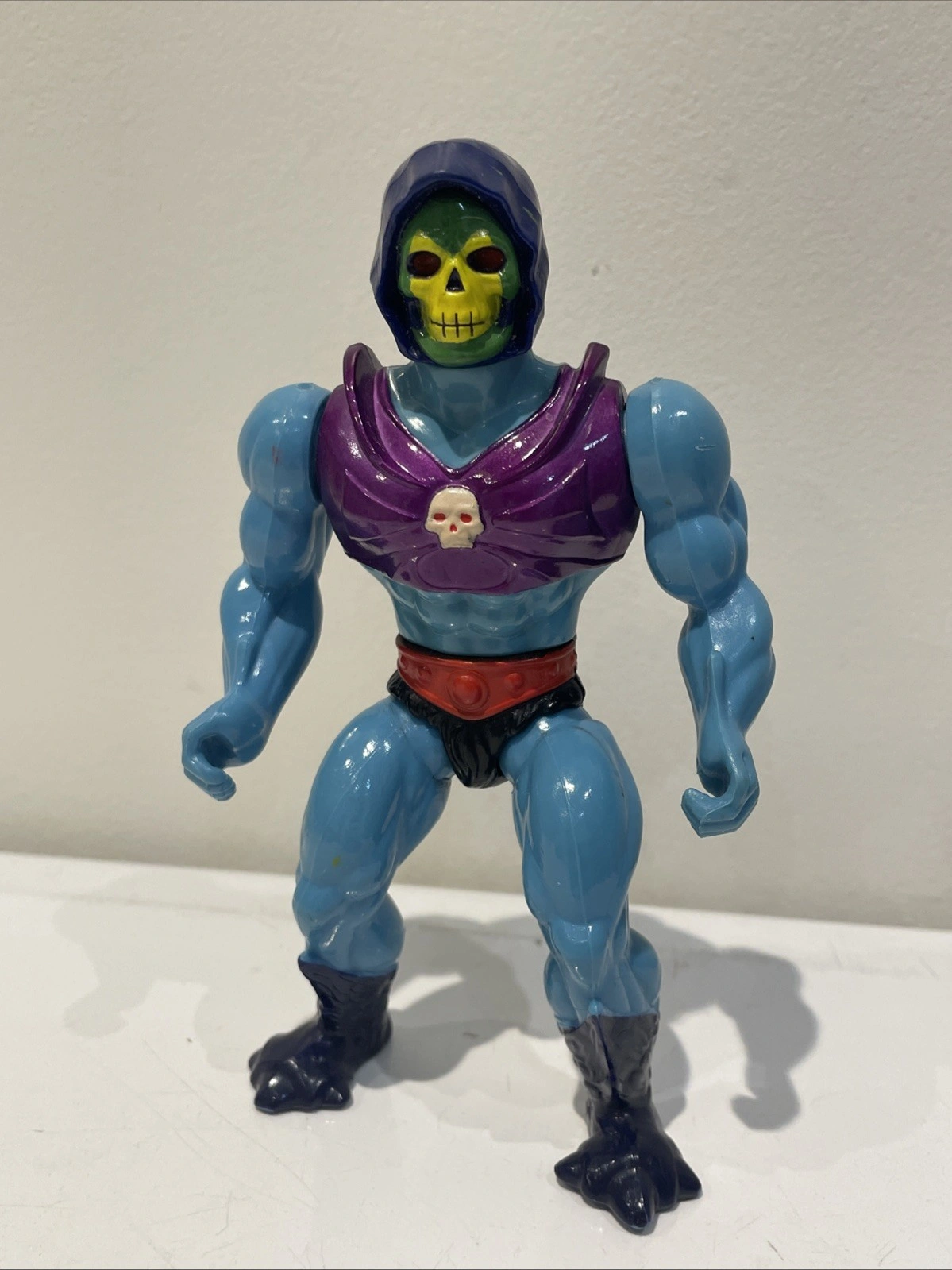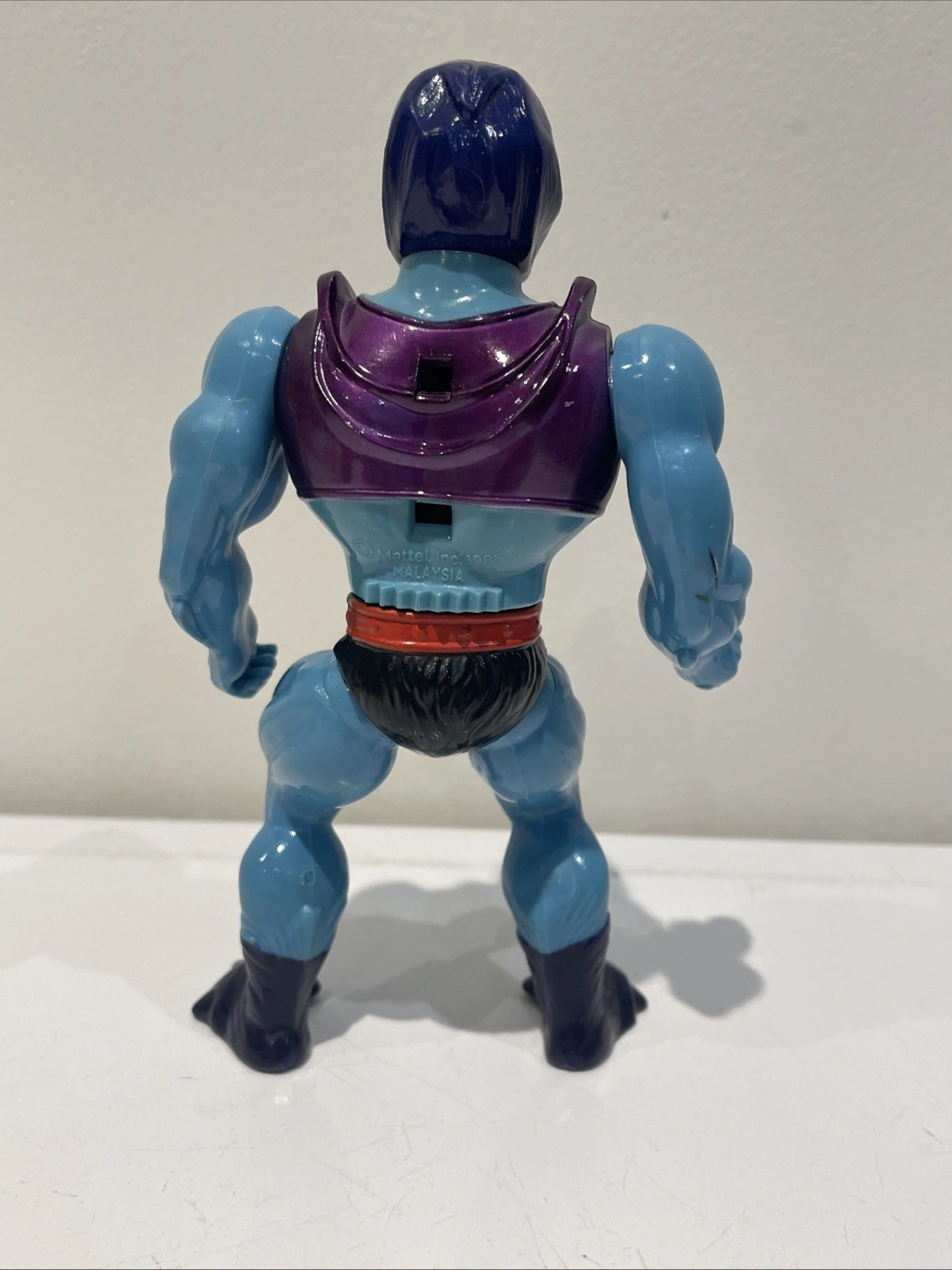 Mattel action figure, character Skeletor, year 1985, from the Masters of the Universe franchise. Made in Malaysia.