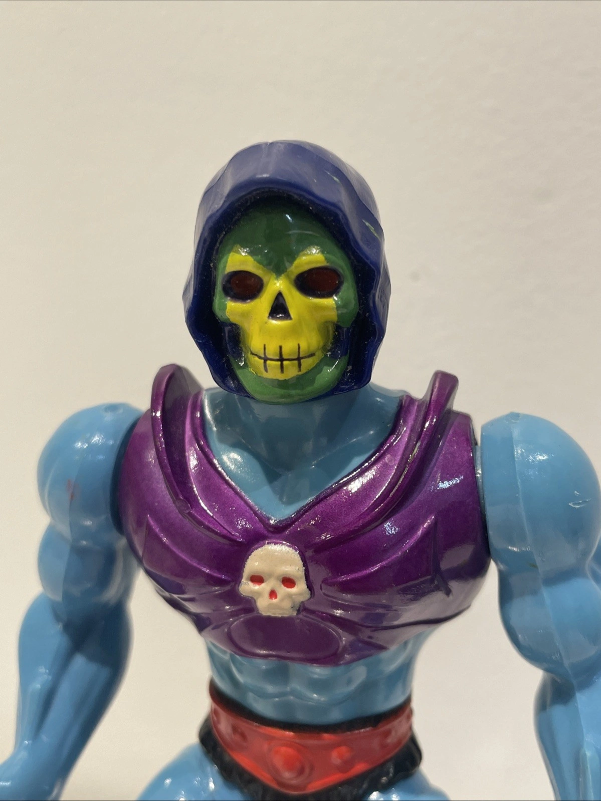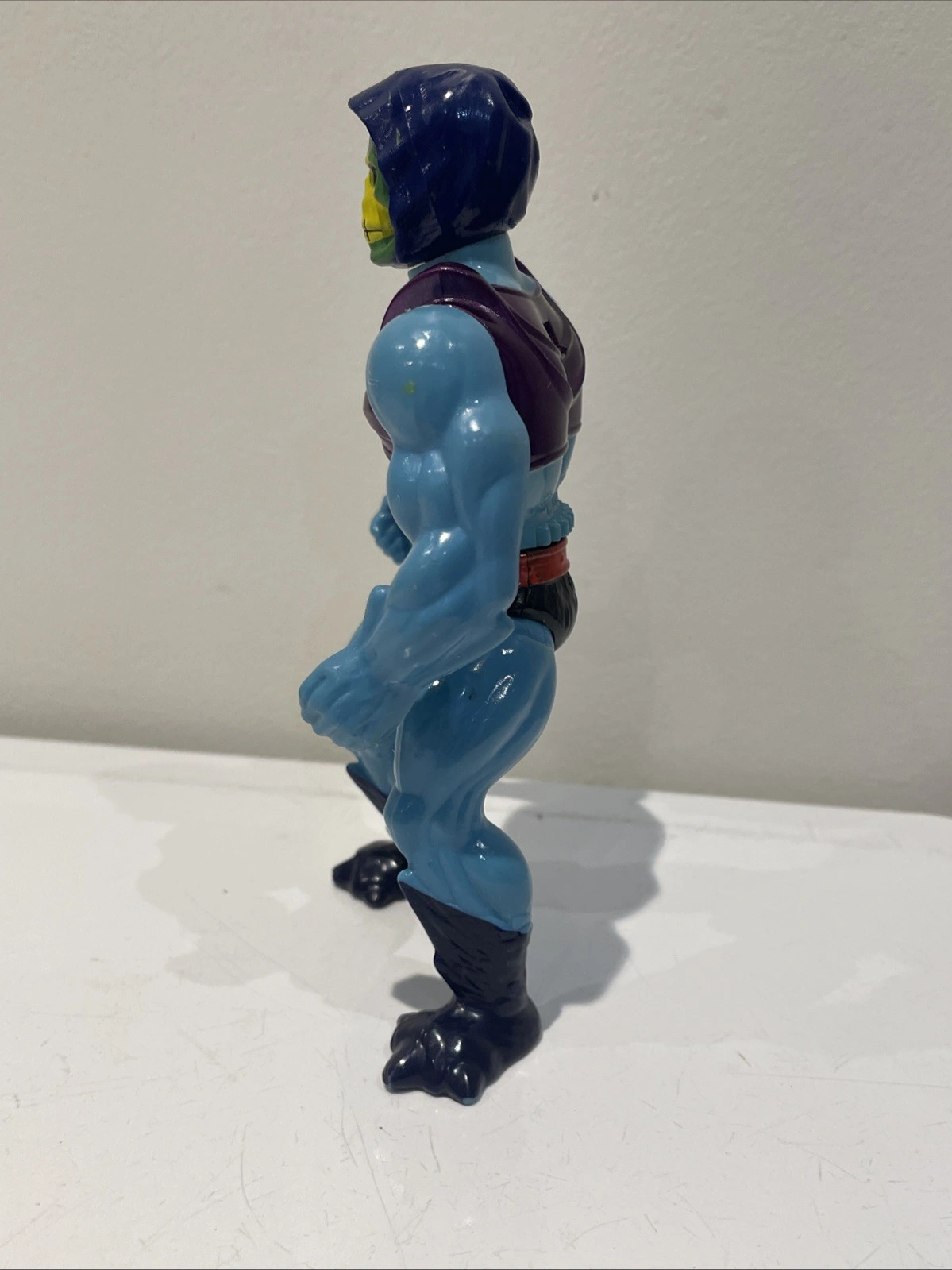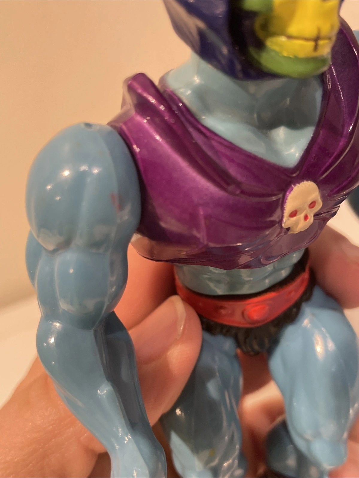 Mattel action figure, character Skeletor, year 1985, from the Masters of the Universe franchise. Made in Malaysia.