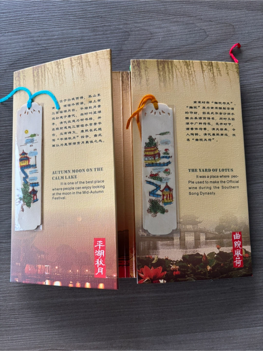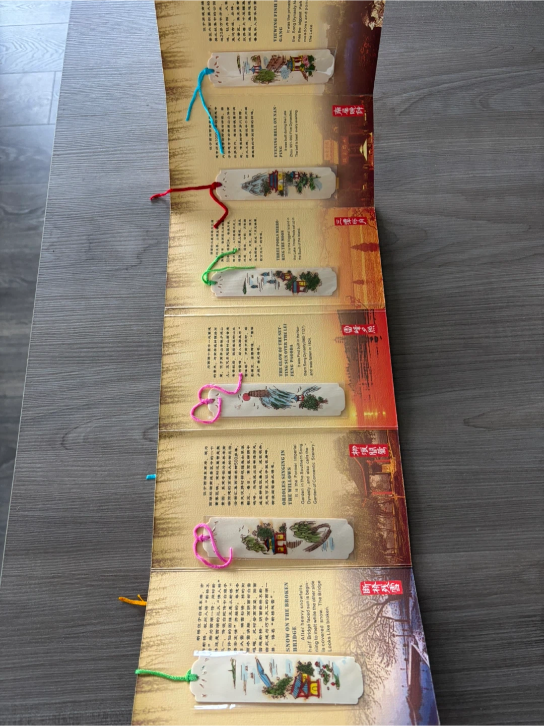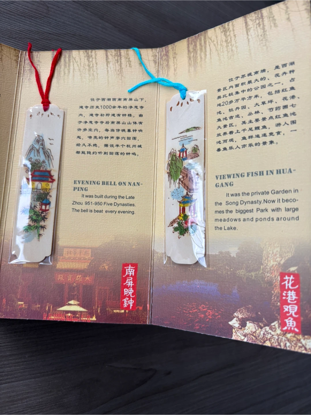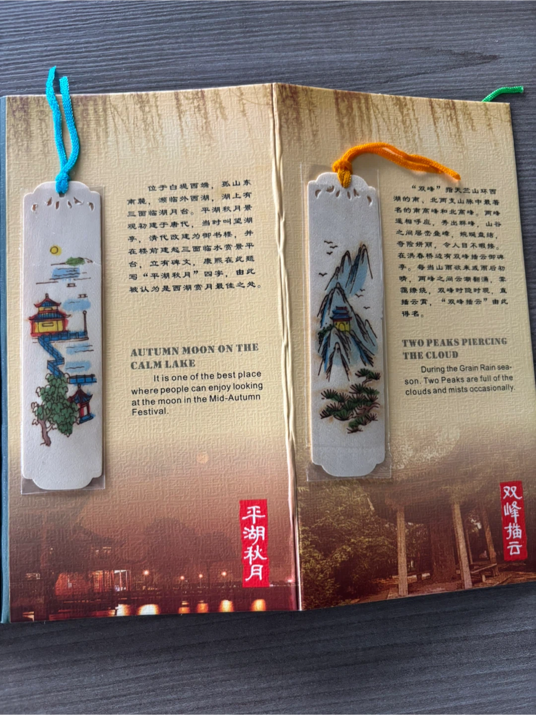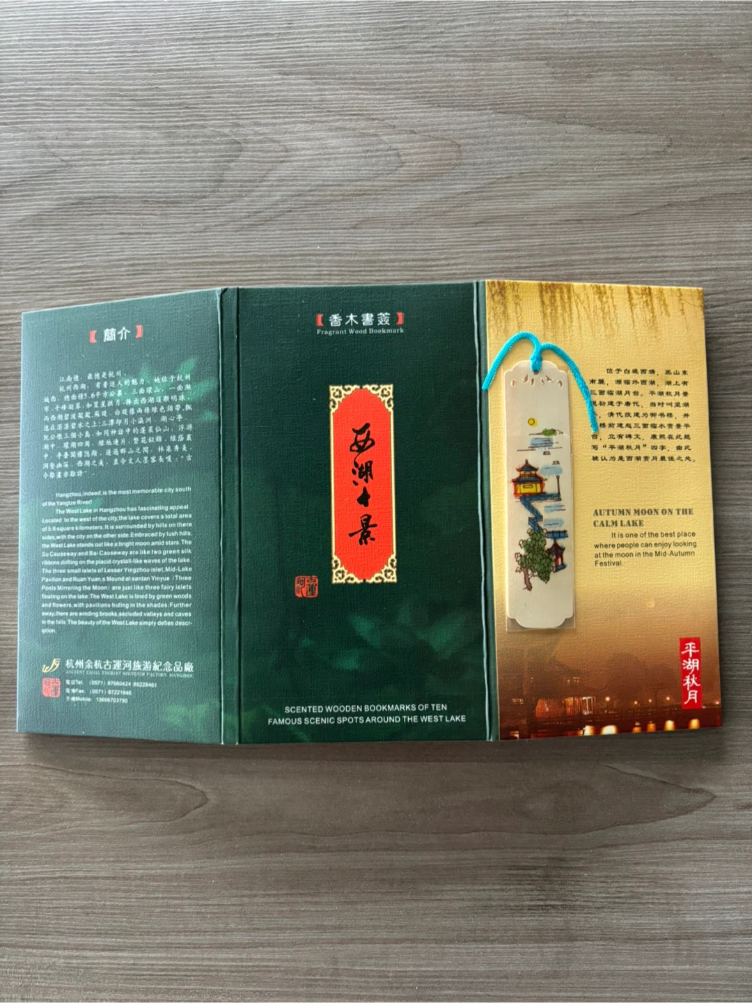 A set of ten scented wooden bookmarks, each depicting a famous scenic spot around the West Lake. These bookmarks are made of fragrant wood. They feature beautiful traditional Chinese artwork and poetry.