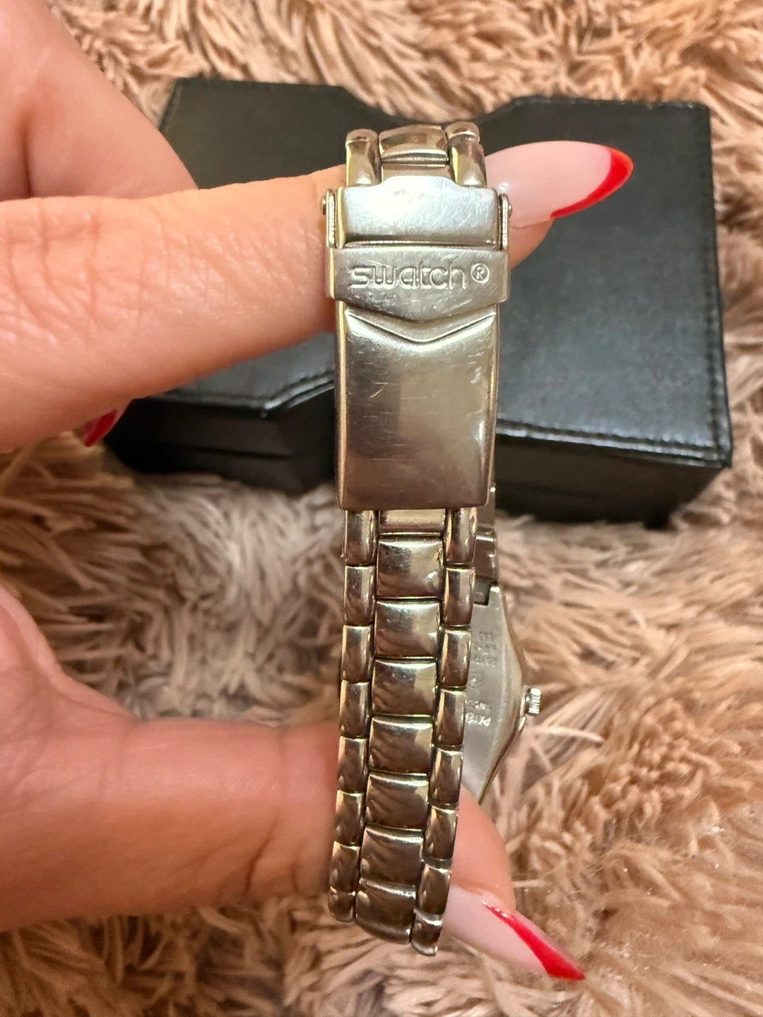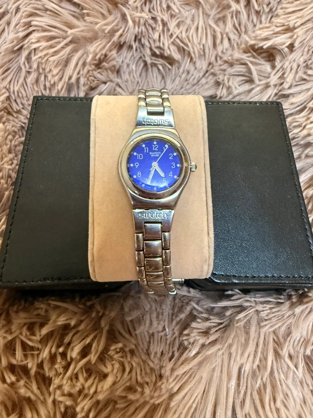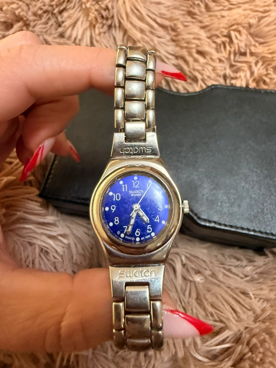 Swatch Irony stainless steel watch with a blue face. Patented water-resistant design.
