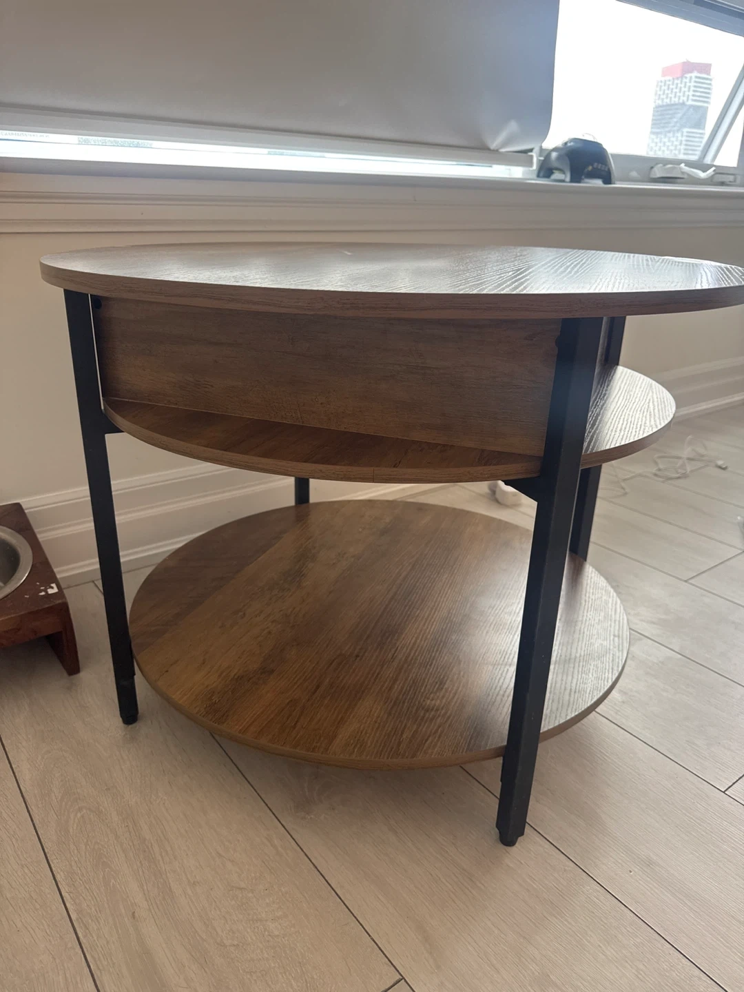 This round coffee table features a lift-top design for hidden storage. It's constructed with a wood-look finish and sturdy black metal legs. The table has two tiers of shelving plus a concealed compartment when the top is closed.