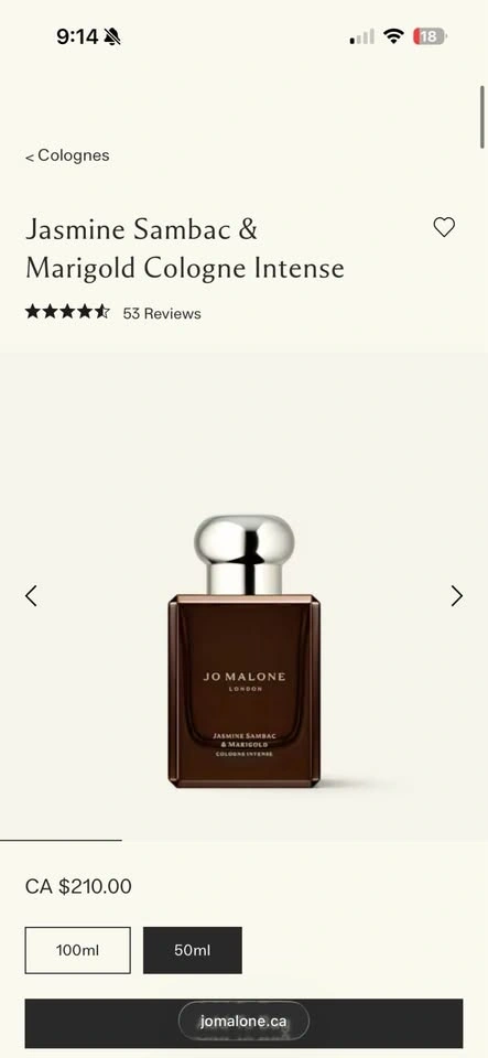 Buy & SellJo Malone Jasmine Sambac & Marigold Cologne Intense 50 MLJo Malone Jasmine Sambac & Marigold Cologne Intense 50 ML$130Luxurious Jo Malone London Jasmine Sambac & Marigold Cologne Intense. This 50 ML bottle has a beautiful scent. Bottle is almost full.WHERE TO MEETCheck LocationView MapSELLERverifiedALCity Center681 review0 chats·0 favorites·10 viewsSEND CHAT TO SELLERHi AL! I’m interested in your listing.Hi AL! I’m interested in your listing.Get the Karrot app to chatSign In to chat