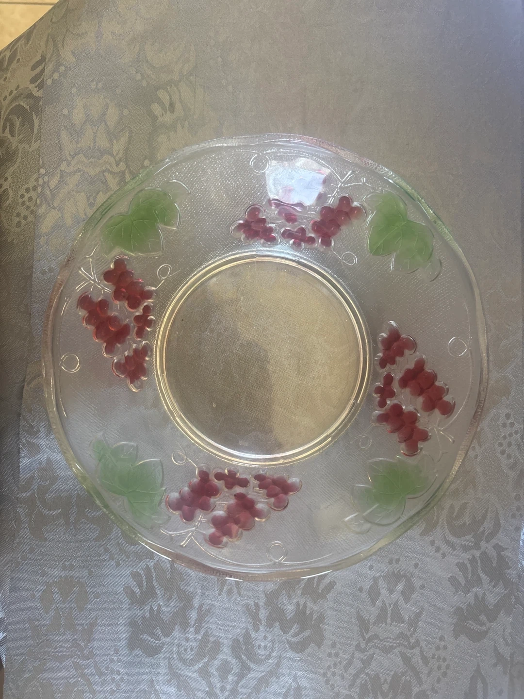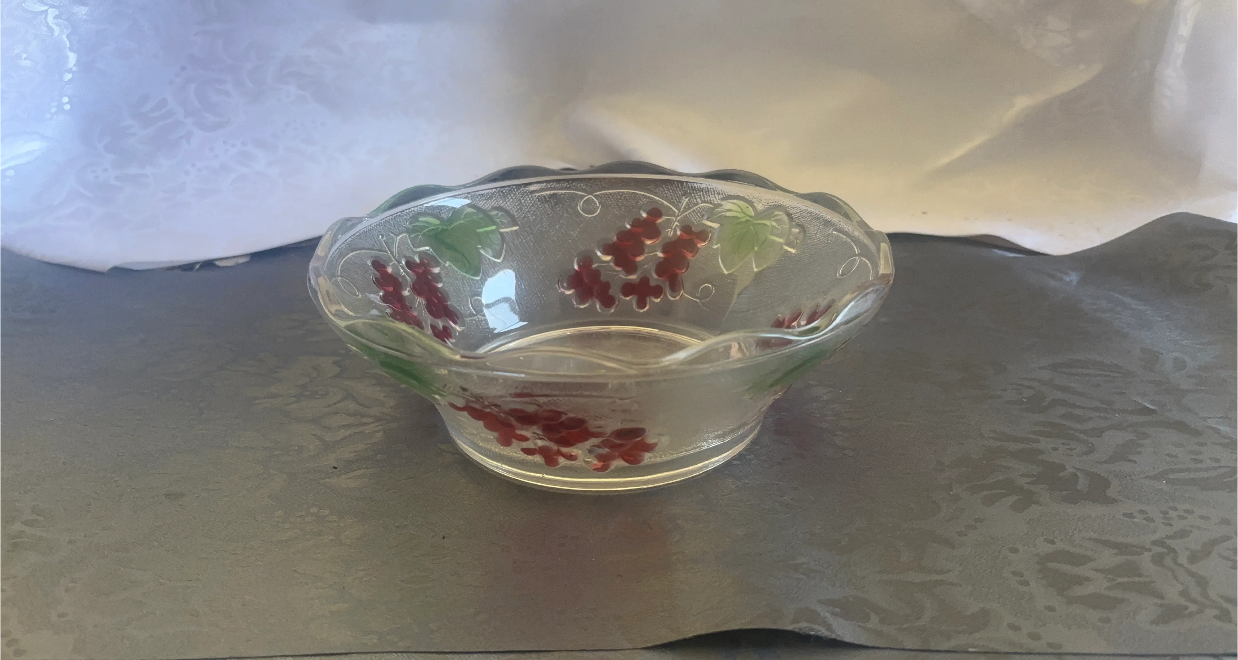 This clear glass bowl features a charming grape and leaf design. Its scalloped edge adds a decorative touch. It's perfect for serving snacks or small dishes.