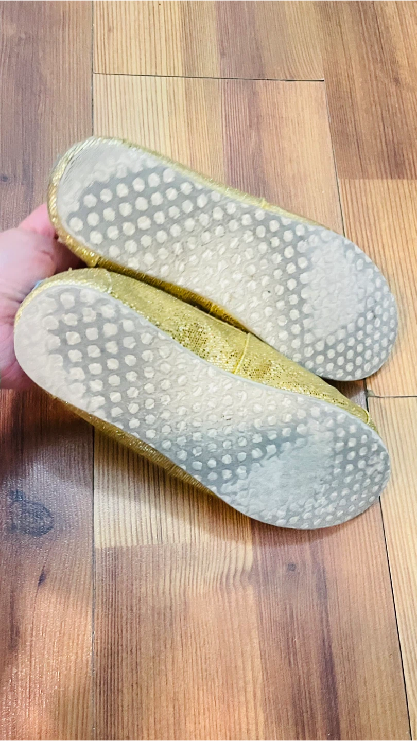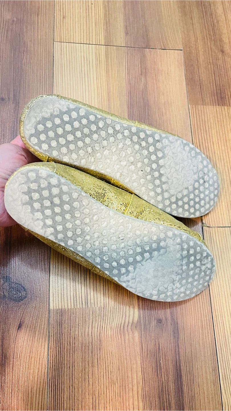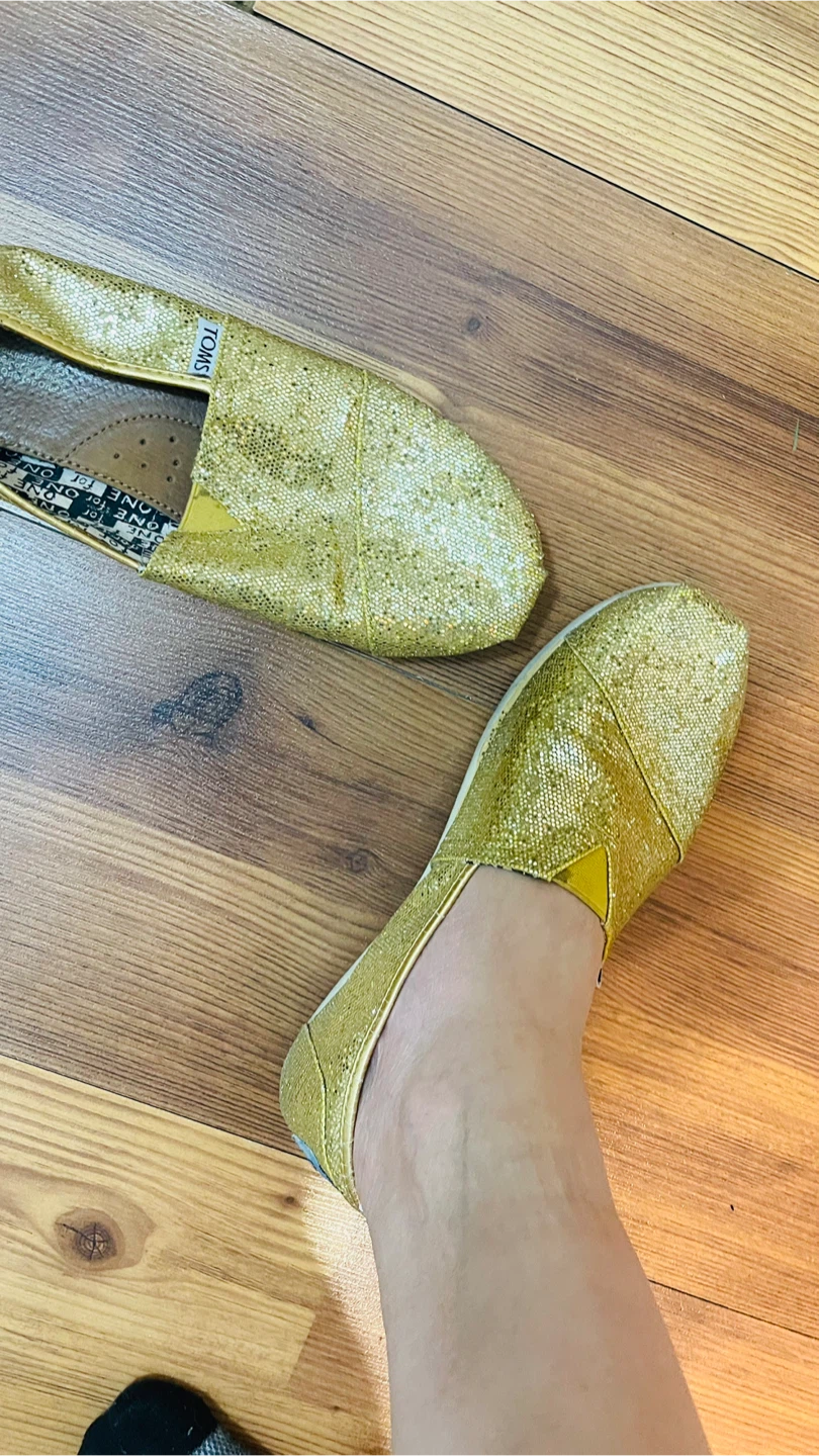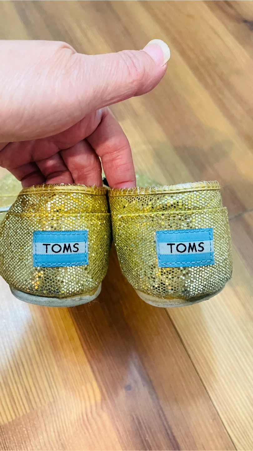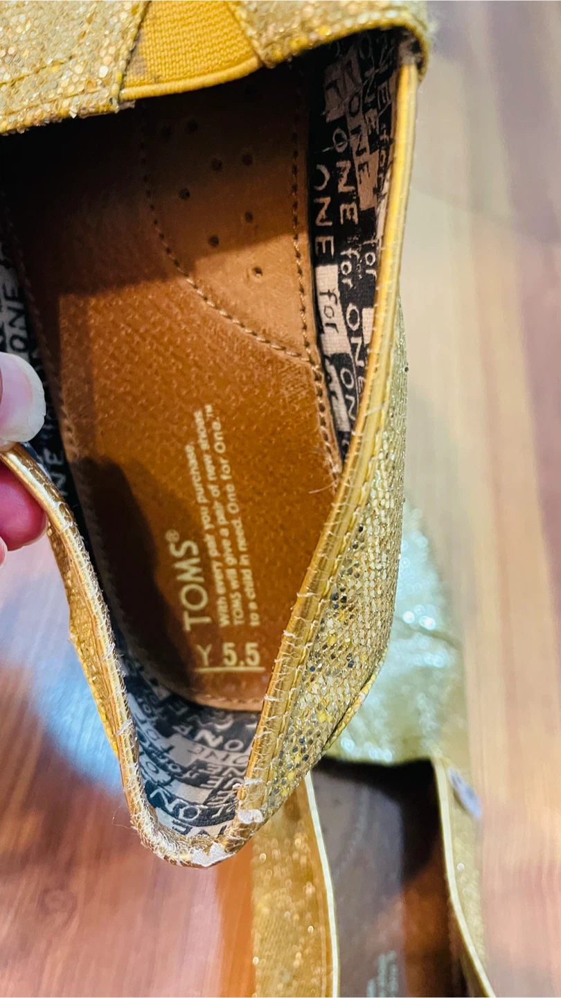 Sparkly gold glitter TOMS slip-on shoes. Classic canvas upper with rubber sole.
