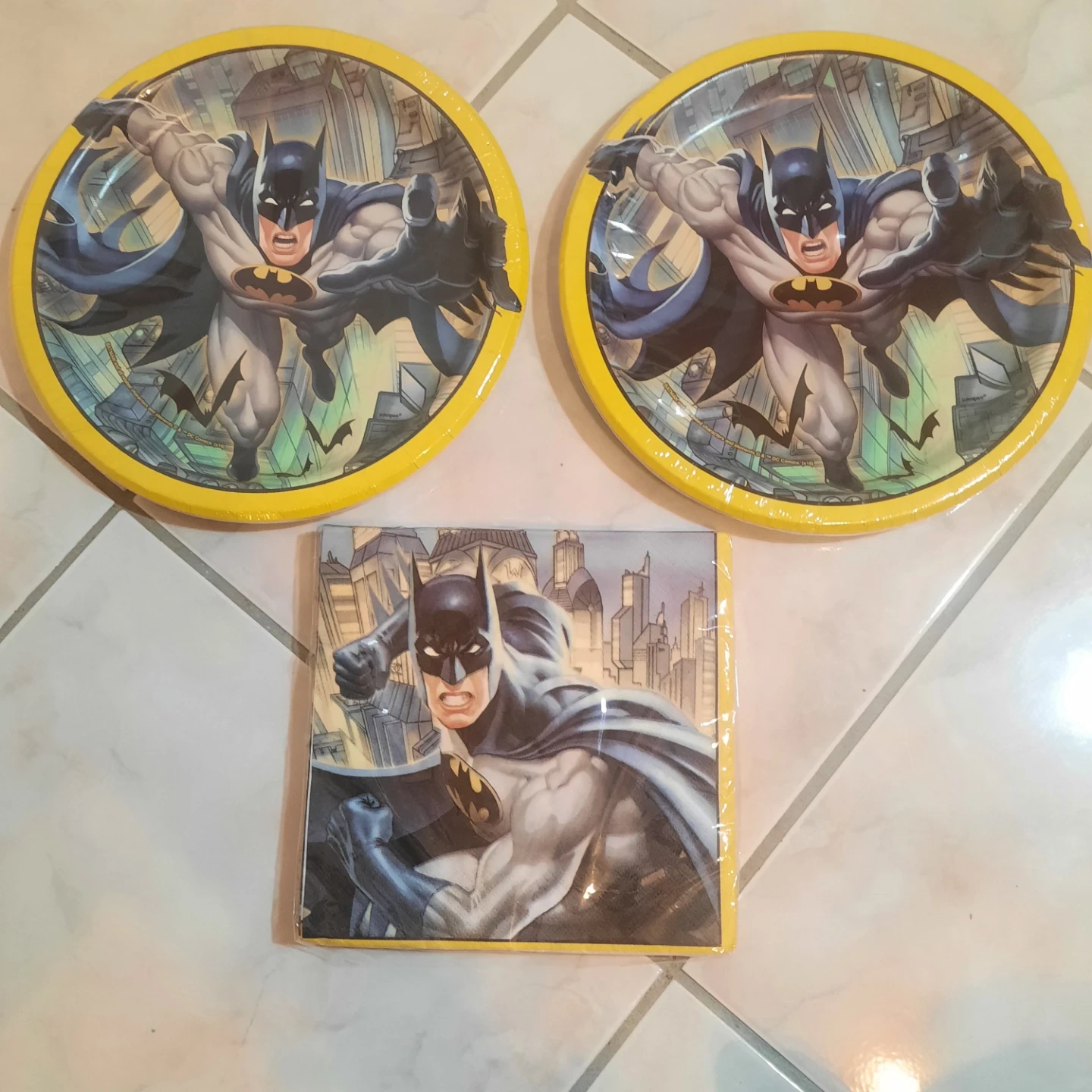 This set includes Unique brand Batman themed paper plates and napkins. Perfect for a Batman fan's party!